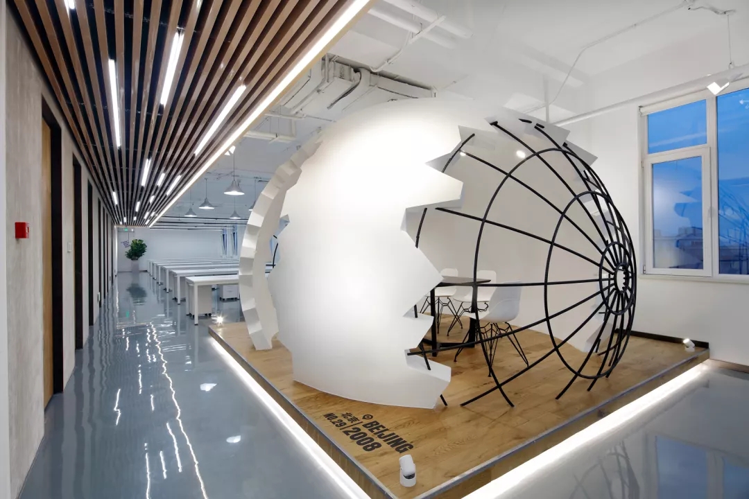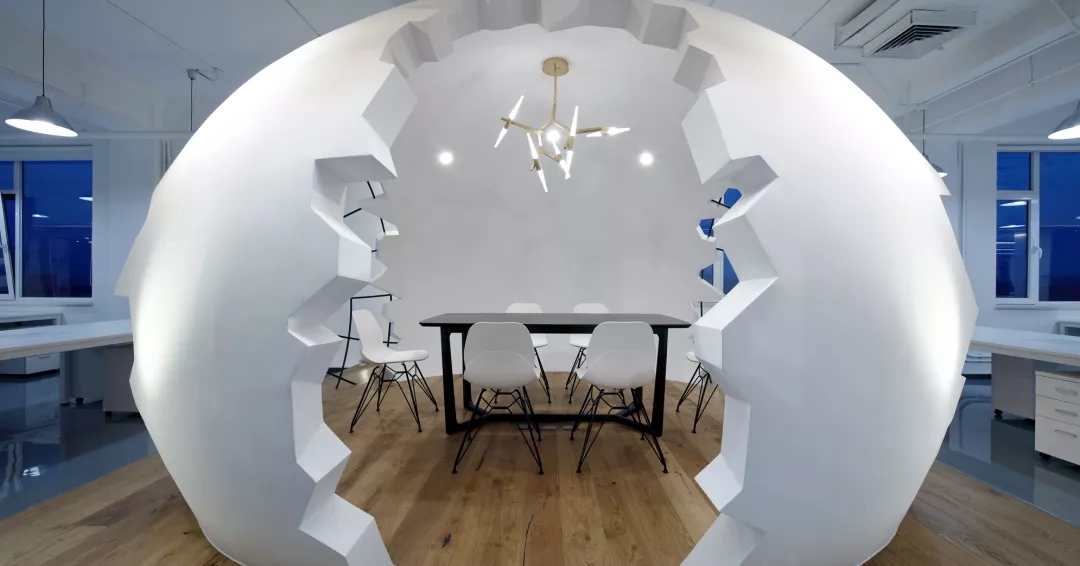 為了給開(kāi)放式的辦公空間注入活力,我們?cè)谂排抛墓の粓?chǎng)地正中設(shè)置了“破殼而出“的主形象——巨蛋討論區(qū),橢圓形的蛋壁實(shí)現(xiàn)攏音的隔音效果,兩側(cè)的鏤空引入自然光源,令這個(gè)裝置藝術(shù)般的討論區(qū)打破開(kāi)放式工位的沉悶,成為視覺(jué)焦點(diǎn)。
