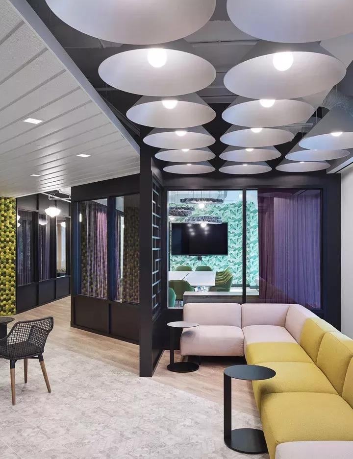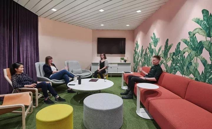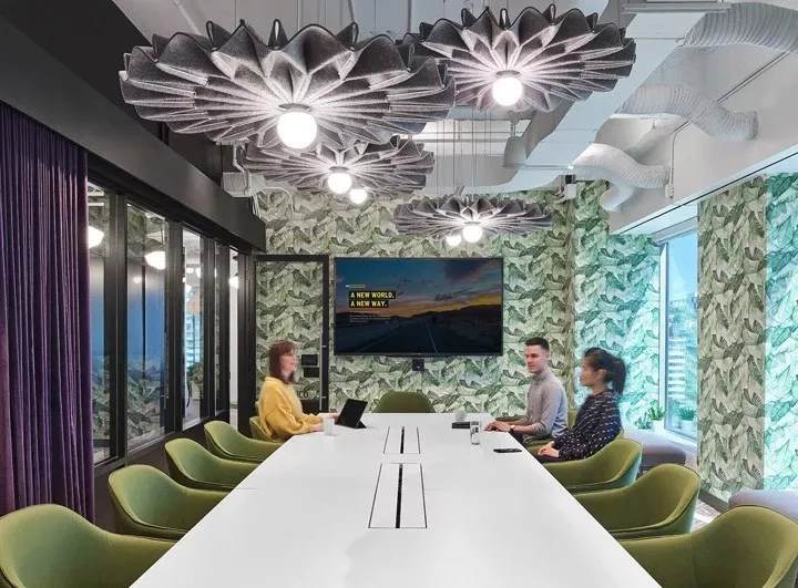 一間正式會議室,墻面鋪滿了綠色棕櫚葉墻紙,并配以綠色扶手軟椅,在綠色清新風中,具有吸音性能的紫色布藝窗簾形成鮮明的色彩對比。毛氈聲學燈具BuzziPleat更是為整個空間錦上添花,帶來美美的視覺。