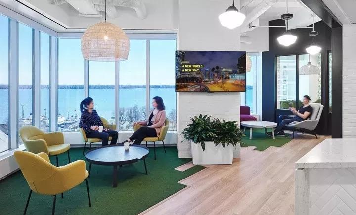 如“起居室”般的非正式會議室,則裝飾以居家般的家具營造舒適的氛圍,透過開敞的落地窗,煙波浩淼的安大略湖的美景盡收眼底,縱目四望,曠達不羈。綠色草皮般的地毯在這里隨處可見。