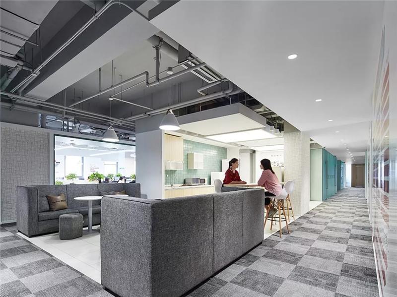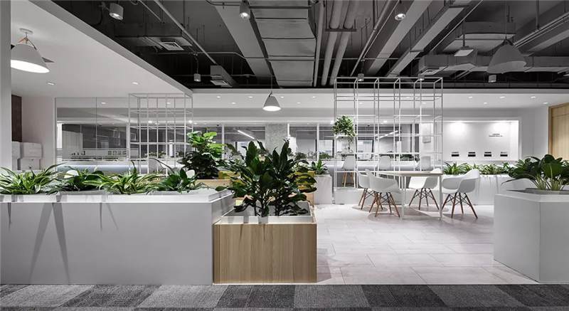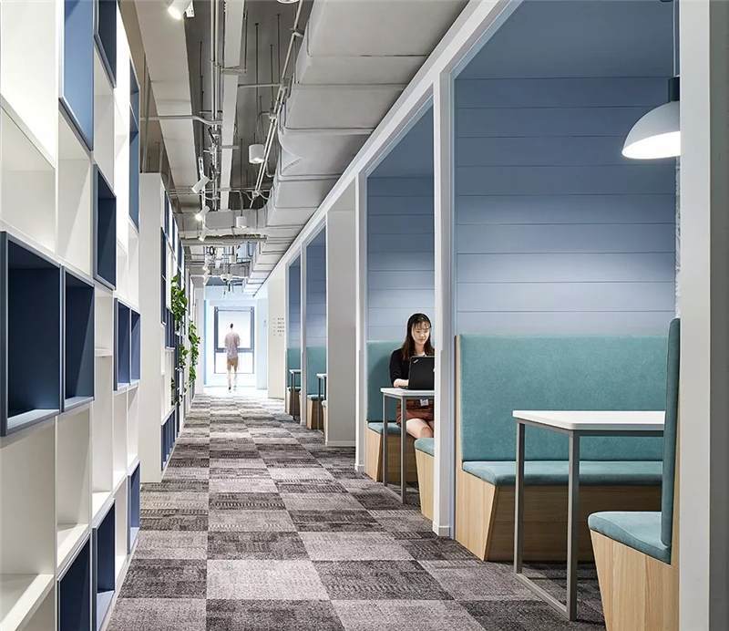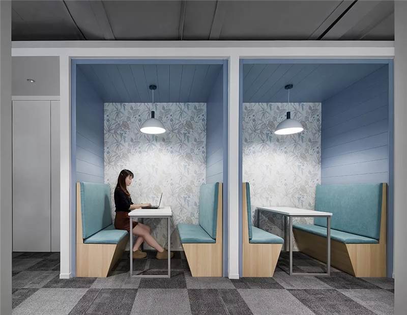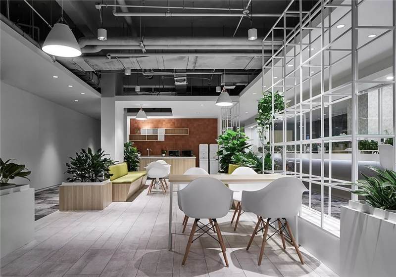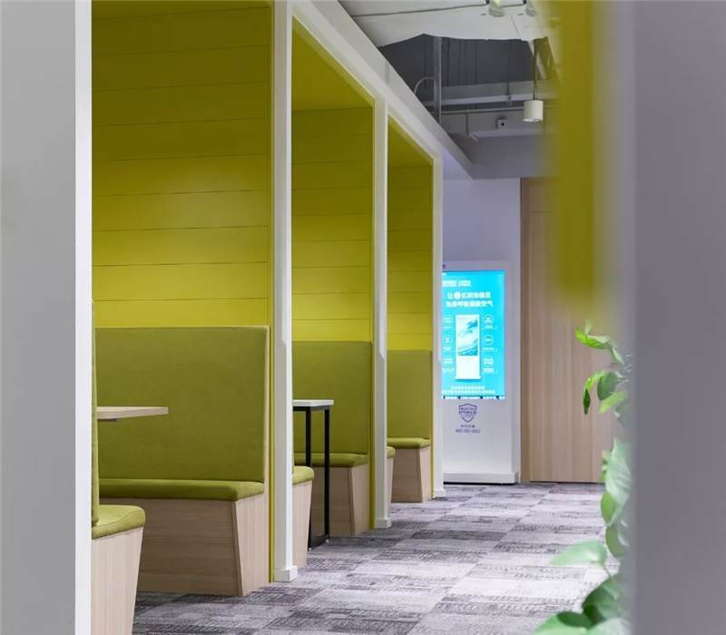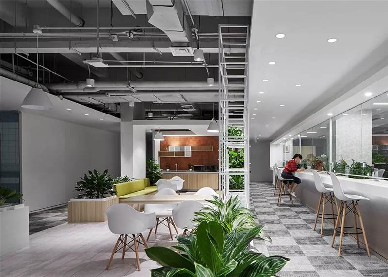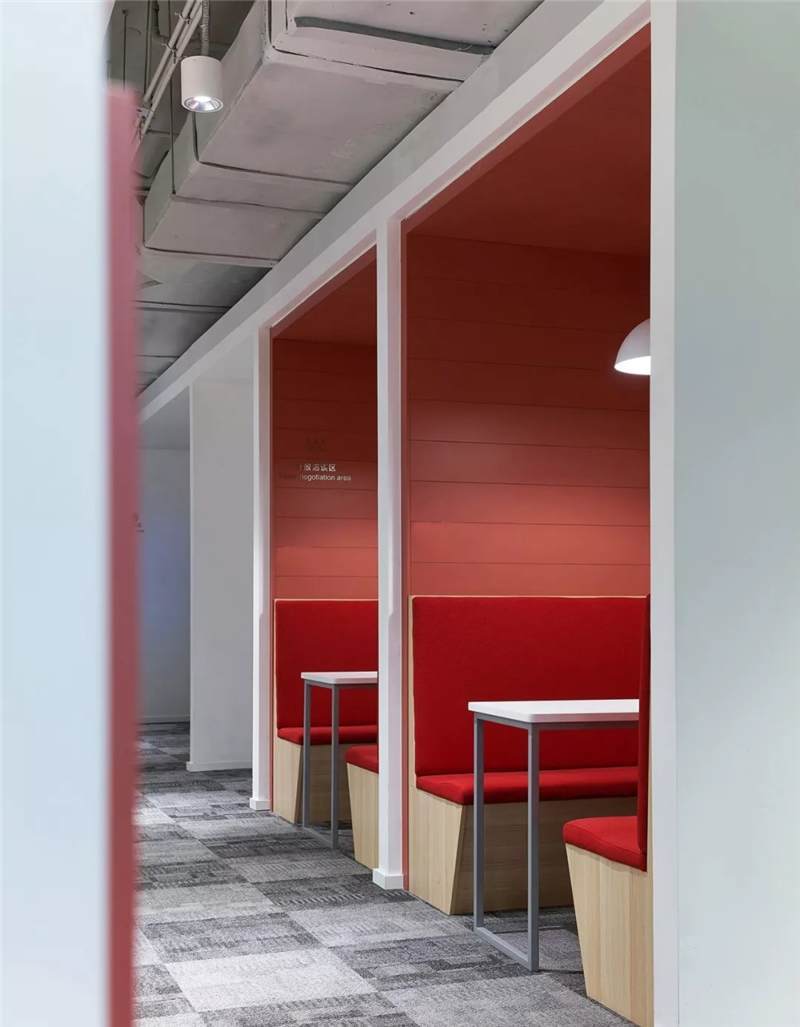 3-6層的各事業(yè)部及旗下子公司辦公層,設(shè)計(jì)師沿著核心筒打造環(huán)形的公共區(qū)域及溝通環(huán)廊帶,依次布置開放休憩洽談區(qū),電話亭,小型會議室,茶水間,衛(wèi)生間,涂鴉板等促進(jìn)溝通交流但界限模糊的混合功能區(qū),并采用卡座,綠植,通透金屬框架,玻璃配以貼膜,墻貼等方式營造公共區(qū)域與辦公區(qū)之間的多層次關(guān)系,形成自由穿梭的辦公空間動線。
