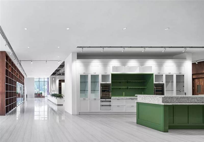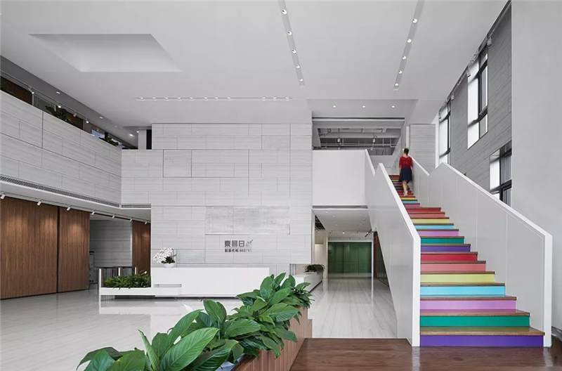 前廳大堂采用高挑空結(jié)構(gòu),用大尺寸純色人造石雕刻工藝打造前臺及LOGO背景墻,背景墻后設(shè)置墻體與東易日盛高端家裝高科技產(chǎn)品一體化展示區(qū),右側(cè)設(shè)置白色穿孔鋁板樓梯配以彩色階梯直達(dá)二層展廳,樓梯平臺以木飾面板點(diǎn)綴綠植打造成休憩待客區(qū),整個(gè)大堂接待區(qū)營造出現(xiàn)代,開放,包容的氛圍。