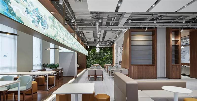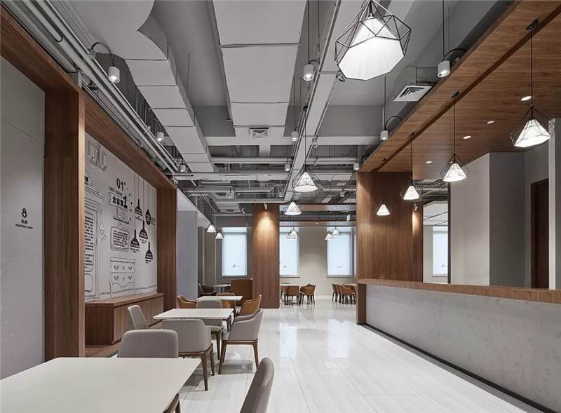 前廳左側(cè)穿越企業(yè)榮譽(yù)展示墻即是咖啡廳和用餐區(qū)。咖色木質(zhì)家具圍合成不同的半私密性空間,黑色幾何線條吊燈及長條形中國傳統(tǒng)園林山水飾面燈箱分別營造出現(xiàn)代與古典相融的用餐氛圍。