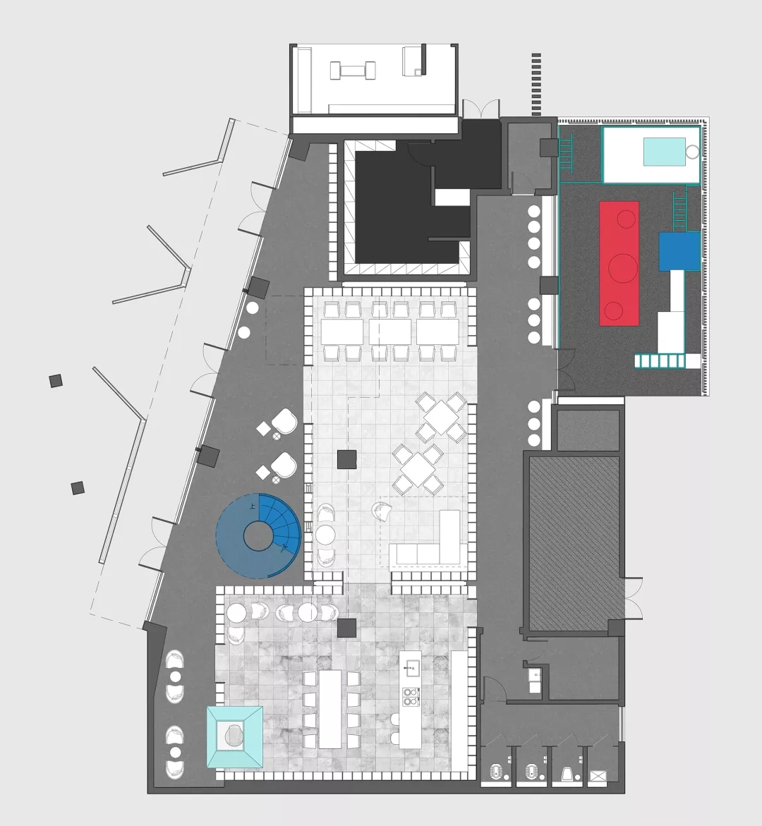 功能盒子是用于快遞收發(fā),社交盒子是客廳+閱讀,女性盒子是廚房+兒童天地。各個(gè)盒子相對(duì)獨(dú)立,動(dòng)靜分離。社交盒子在策劃中被重視,而我覺(jué)得女性盒子才是實(shí)際運(yùn)行中的核心,畢竟社區(qū)的主力是女性和孩童,廚房區(qū)域不僅可以用來(lái)做廚藝課程,居民也可以預(yù)定廚房區(qū)域作為聚會(huì)的場(chǎng)所。女性盒子才是真正意義上的社交盒子,而原來(lái)的社交盒子是日常休息和女性盒子功能的延續(xù)。