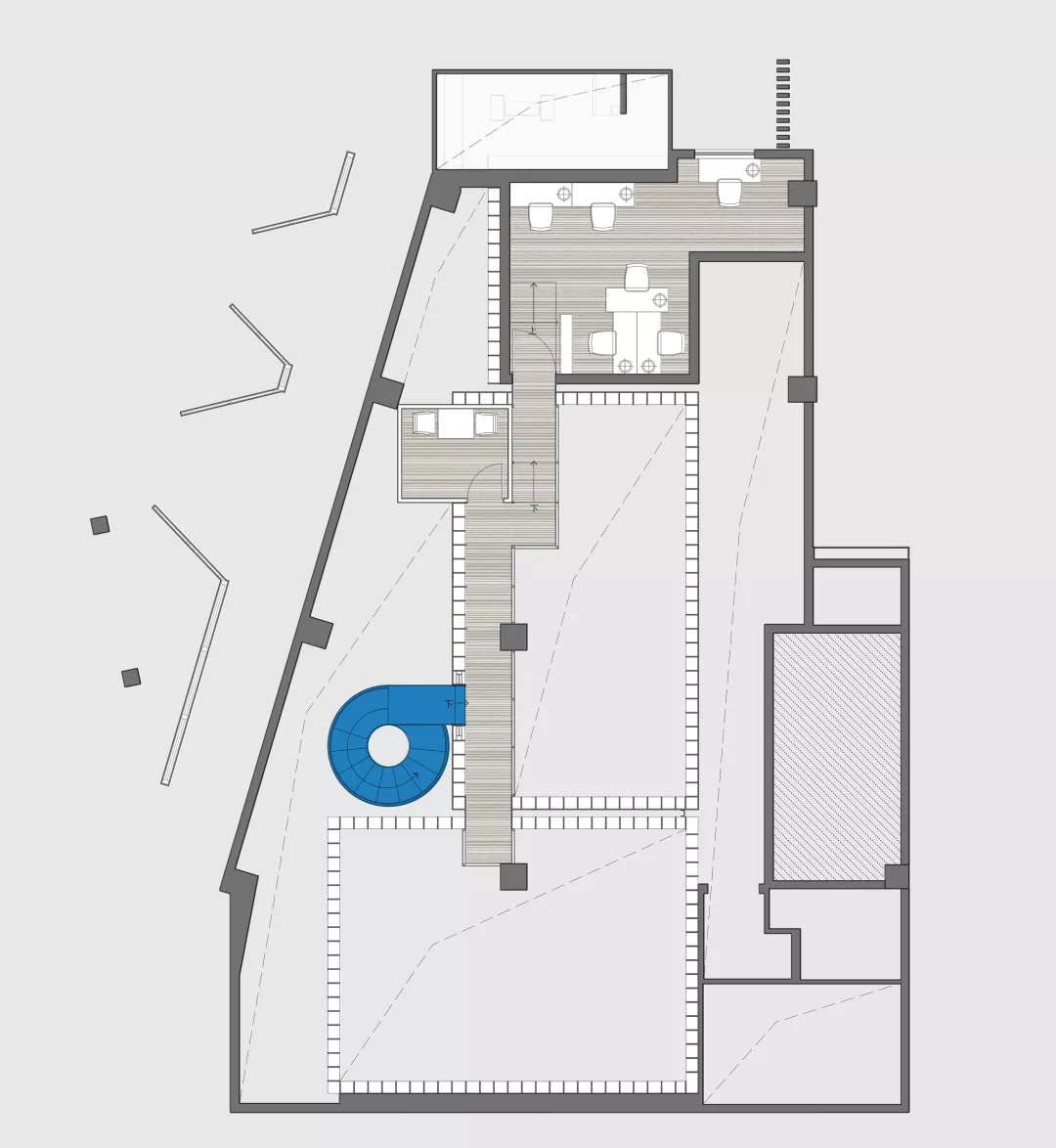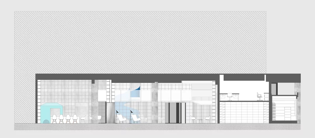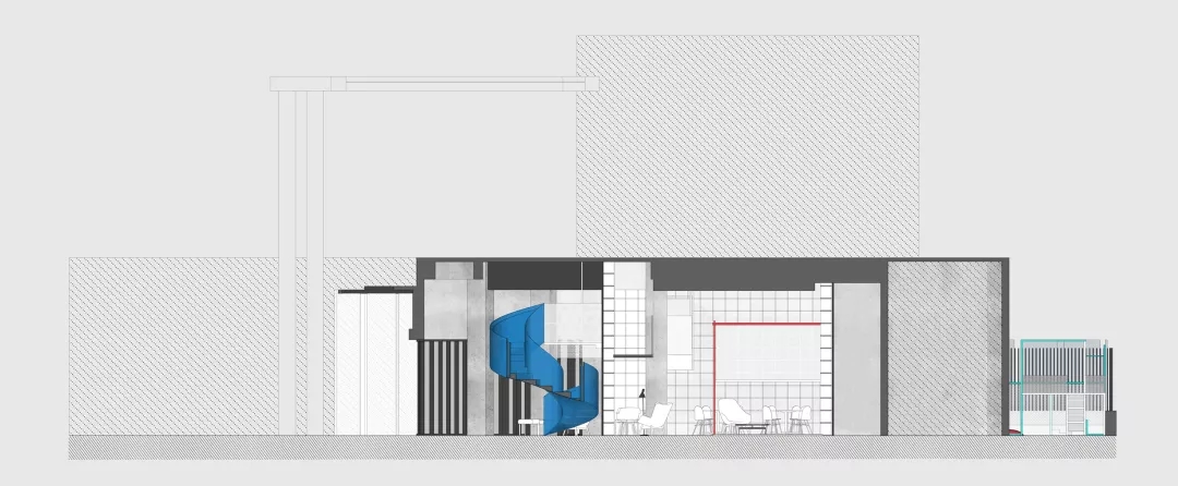 我們?cè)O(shè)計(jì)了一個(gè)夾層走廊隱藏在書(shū)架上.在課題研究中如何利用層高一直是房產(chǎn)商關(guān)心的,以我的實(shí)際經(jīng)驗(yàn),凈高2.1米仍然具有一定舒適度。在本案中,原本懸在社交盒子上的麻將房因?yàn)橐粯菍痈哌^(guò)低無(wú)法成立,于是我們直接切斷,形成一個(gè)小陽(yáng)臺(tái)作為暗示。