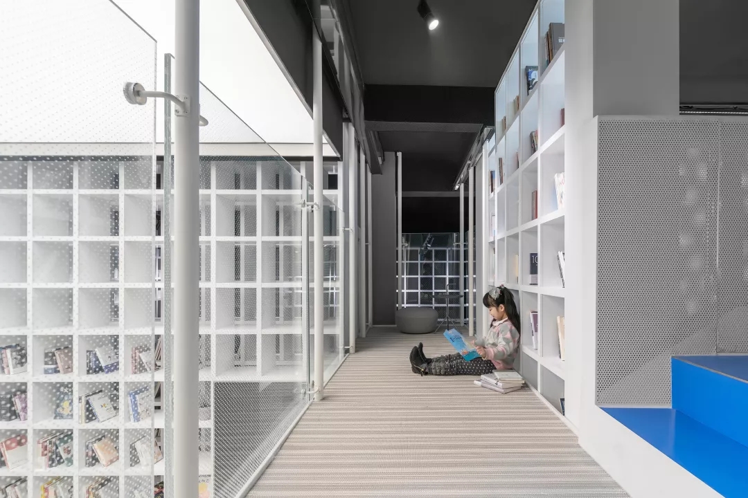 我用蒂芬妮藍(lán)閱讀屋作為女性盒子的中心,與此呼應(yīng)的是入口可見(jiàn)的卡萊茵藍(lán)螺旋樓梯,以及盒子背面室外的明黃色兒童活動(dòng)場(chǎng)地。他們精致地鑲嵌在有些迷離模糊的空間中成為點(diǎn)睛之筆。如果社區(qū)客廳藏在陳詞濫調(diào)的商業(yè)里面之后,就失去了示范作用。有空客廳的立面就是一個(gè)打開(kāi)的盒子,高4米的半開(kāi)門(mén)是穿孔鋁板制作的,形成了Wutopia Lab標(biāo)志性的半透明界面。你能從這里隱隱約約的窺看到,溫暖的燈光,明亮的藍(lán)色,和孩子的笑聲。