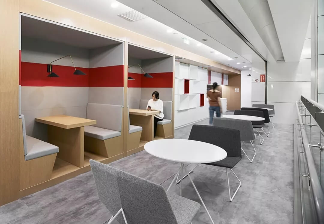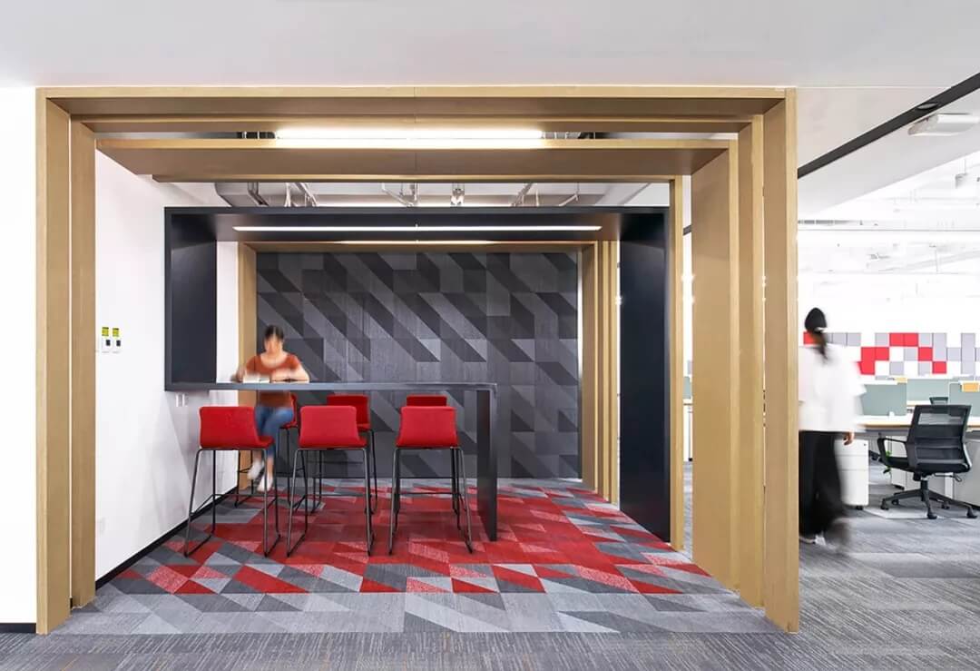 核心筒是整個(gè)辦公空間的混合功能區(qū),頻繁產(chǎn)生互動(dòng)式交流,頭腦風(fēng)暴,也是重要的會(huì)客及自由移動(dòng)式辦公區(qū)。在設(shè)計(jì)上,艾迪爾設(shè)置了滿足不同會(huì)客需求的休閑討論區(qū),連接著標(biāo)準(zhǔn)辦公區(qū)和公共通道,營(yíng)造多層次交流氛圍,體現(xiàn)商湯科技開(kāi)放包容的文化價(jià)值觀。