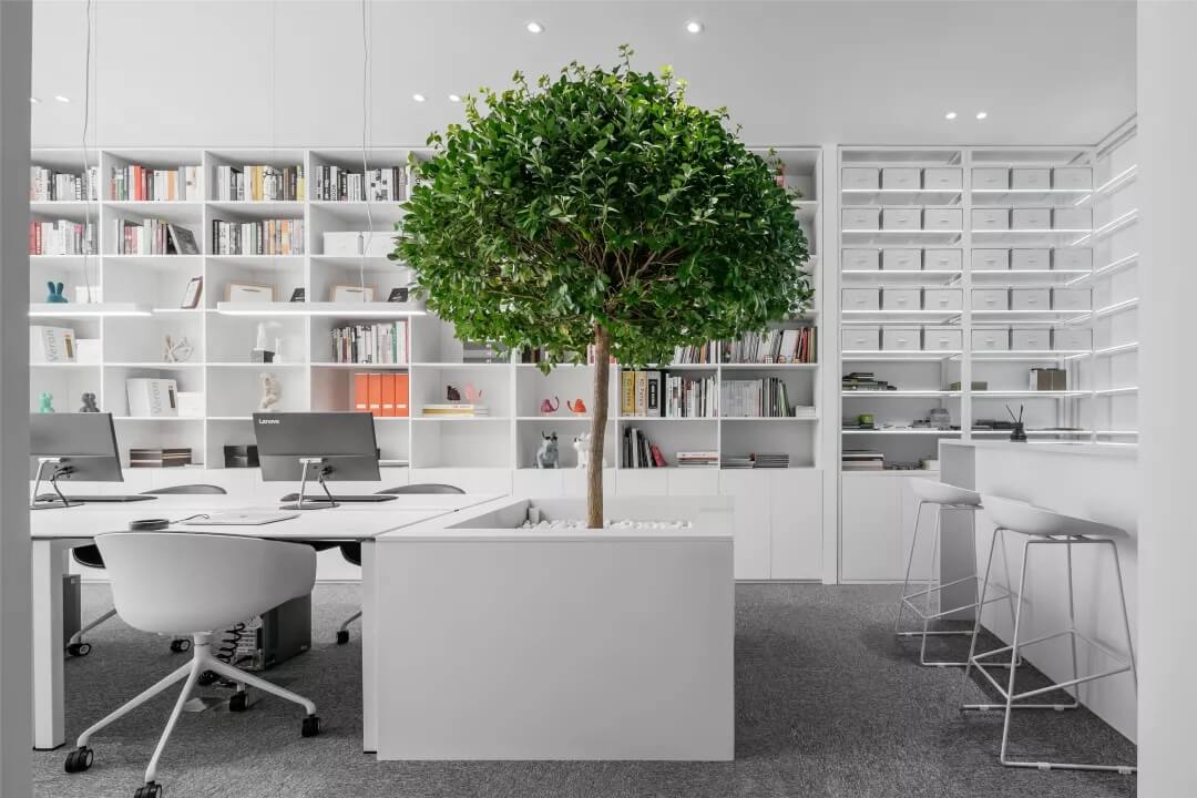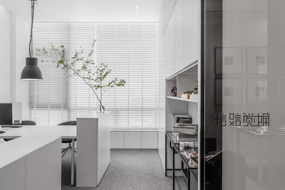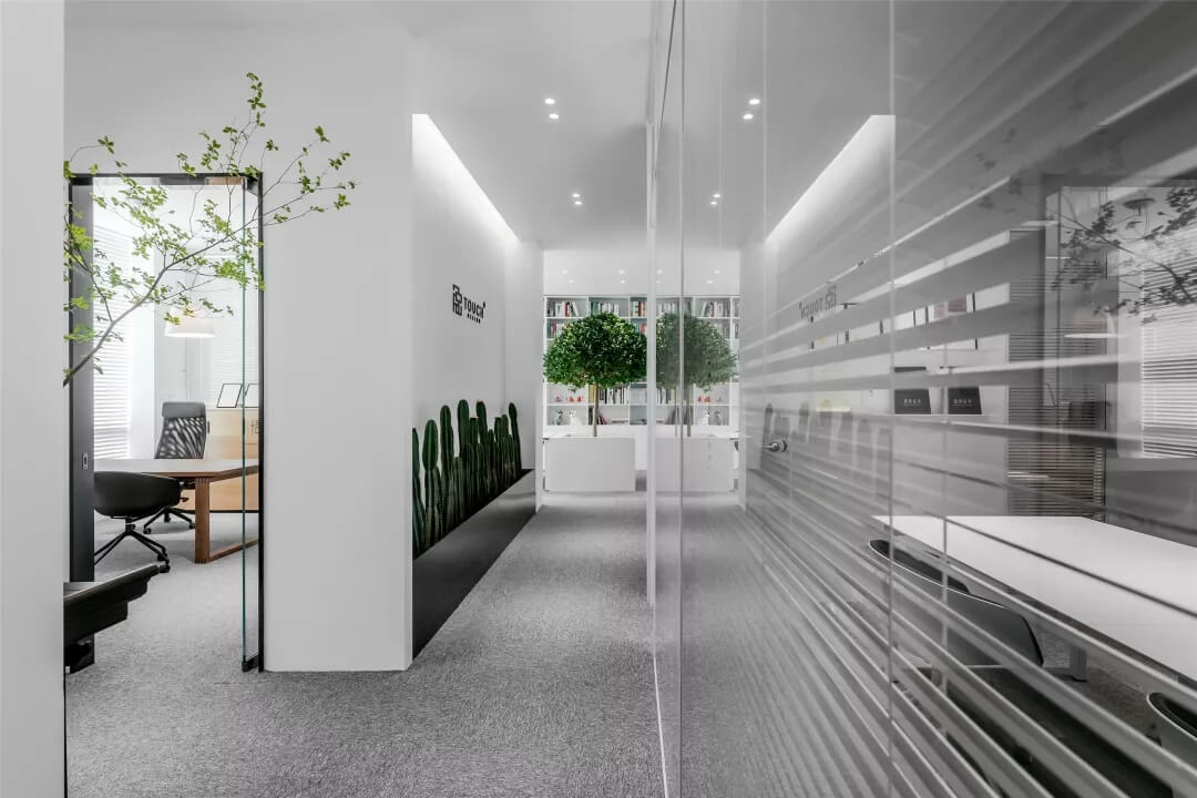 觸覺設(shè)計巧妙擷取文化于當(dāng)代都會空間,展現(xiàn)出雅致韻味的同時留下了更多觸碰的余地。綠植來點亮辦公場所的鮮活生命力,清逸的色彩是思想游龍的軌跡,在留白的空間中伸出觸角,觸覺所及之處,思維綻放遐想。