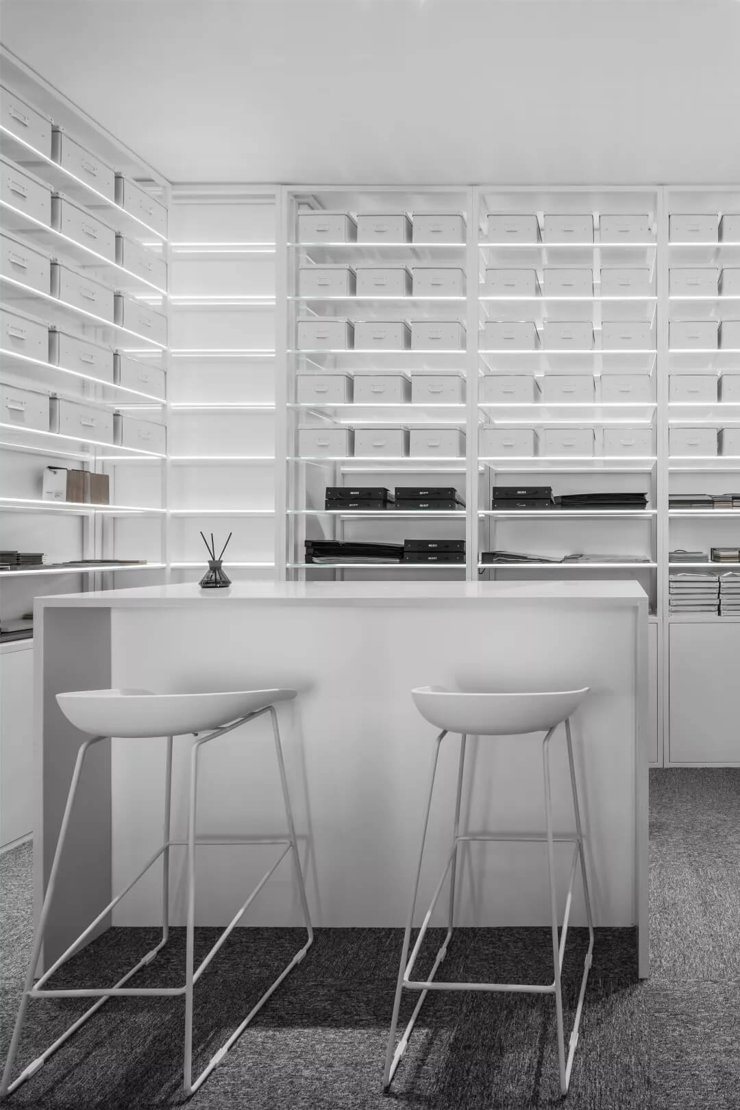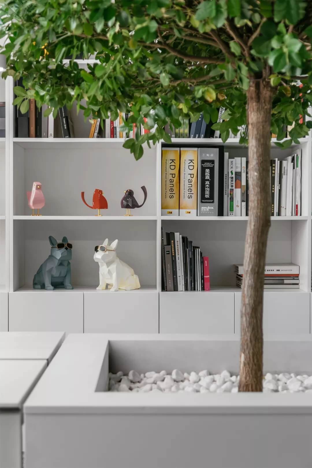 在這里,未知的一切與既有的常識記憶產(chǎn)生傳導(dǎo),想象思維的觸角開始蔓延。小株綠樹分隔出挑高的白色高座式二人桌,提供了一種更為隨性、更利于面對面交流的辦公形式。