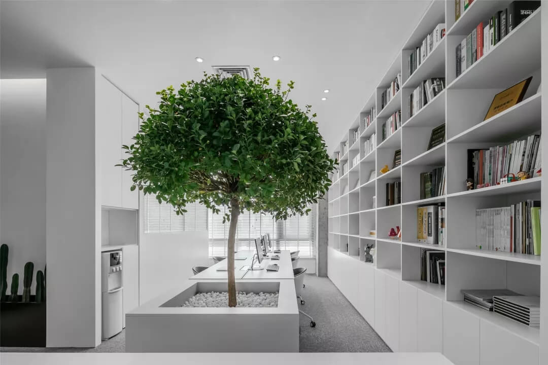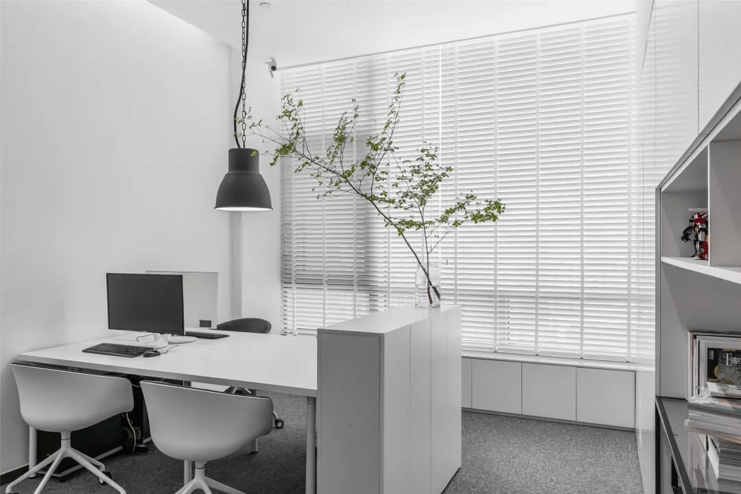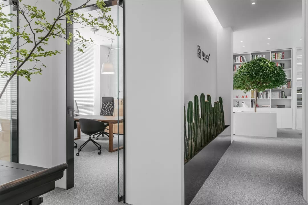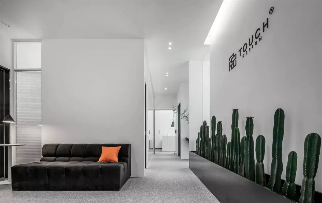 刪繁就簡,以最經(jīng)典的白色為主題搭配色調(diào),沒有繁瑣的辦公室設(shè)計和過多的裝飾,減去辦公中的壓抑感。通過將自然純凈的白色與沉靜黑色相結(jié)合,將品牌形象簡潔地呈現(xiàn)表達(dá),同時為左右空間的過渡創(chuàng)建和諧觀感。純白的墻面,接近心靈的澄凈;仙人掌是視覺的焦點,恣意生長、堅韌、夯實根基,也正寓意著公司的設(shè)計理念:有所依、有所仗、有所長。