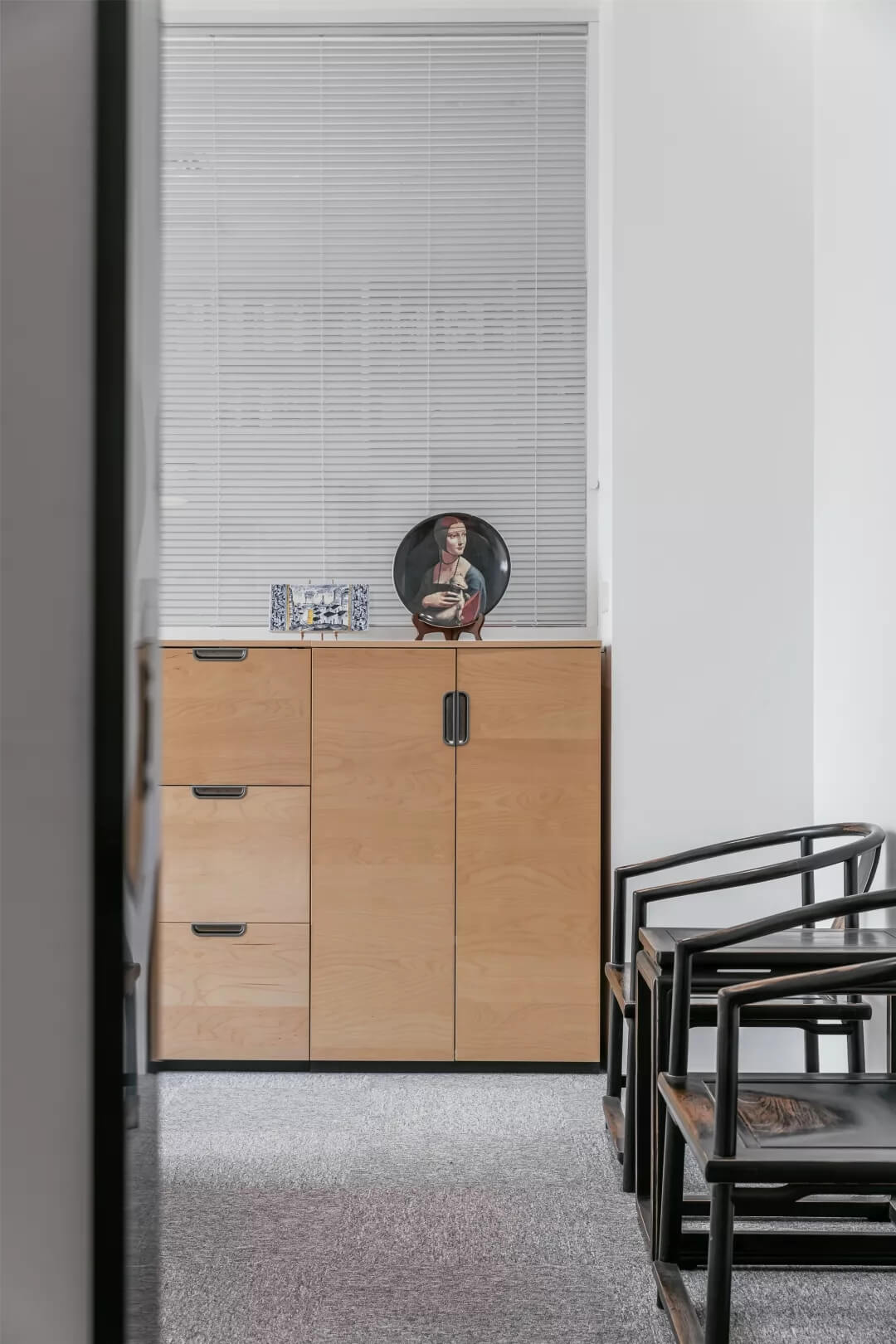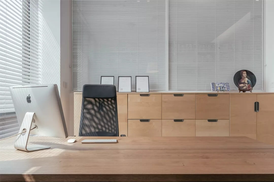 自由無拘的溝通對于團(tuán)隊的創(chuàng)新至關(guān)重要。開放的辦公區(qū)是有效獲取信息和激發(fā)靈感的地方。百葉窗折射的光影,充足的自然光營造高效的工作環(huán)境??臻g雖然有限,但發(fā)揮最大的性能,開辟出一整面的軟裝材料搭配區(qū)。