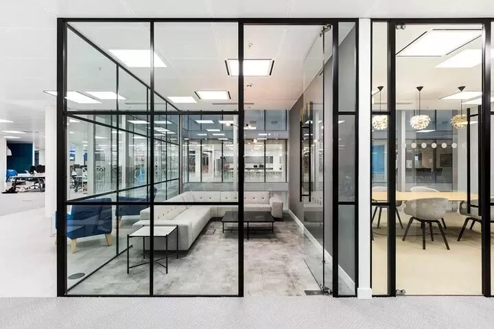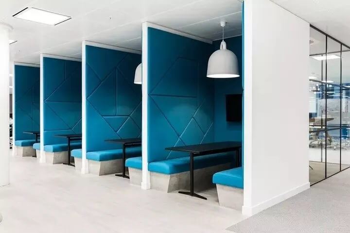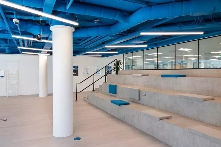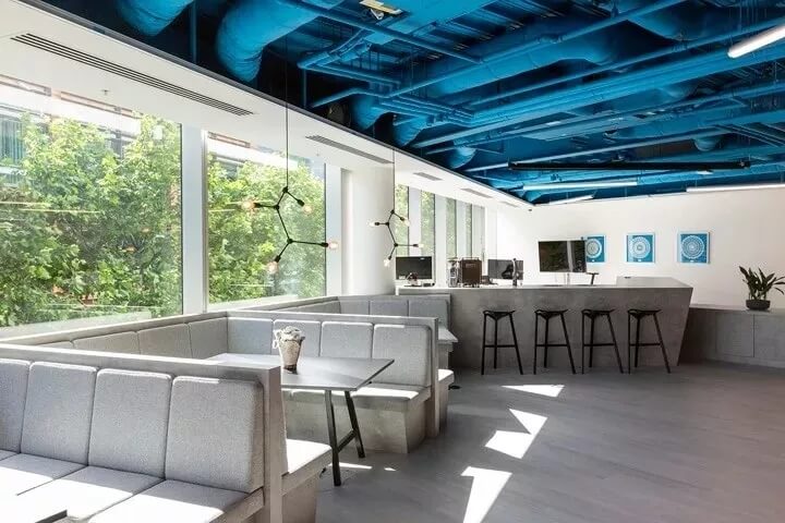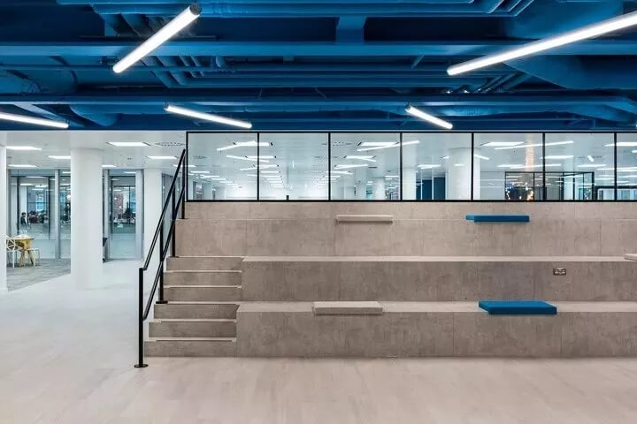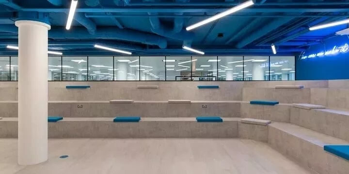 特點:科技,總部、英國、斯堪的納維亞設(shè)計風(fēng)、寧靜自然簡約、灰色、藍(lán)色頂面、水泥質(zhì)感、看臺式階梯座、車廂座、玻璃隔斷