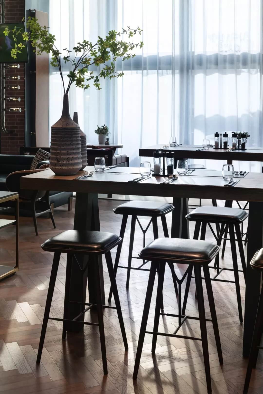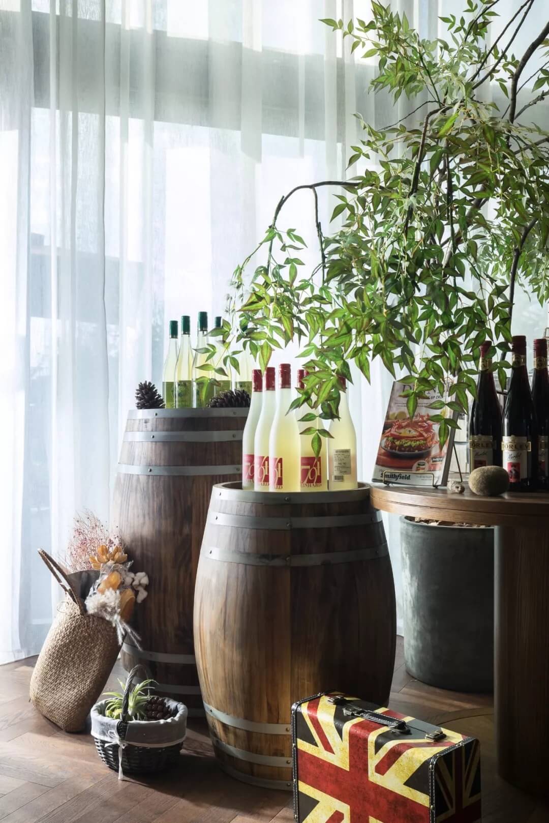 自然的青翠綠意與質(zhì)樸的啤酒桶木藝氣質(zhì)互融,靈韻交加,酒香沁人,不加過多修飾地圍合出一隅相對(duì)靜謐的臨窗休閑區(qū)。在這里,設(shè)計(jì)透過落地玻璃窗的相隔將內(nèi)外視域完全打開,陽(yáng)光傾灑進(jìn)來,引入截然不同的清新與濃密的自然舒適度,外在景觀與內(nèi)在布設(shè)氣質(zhì)相合。