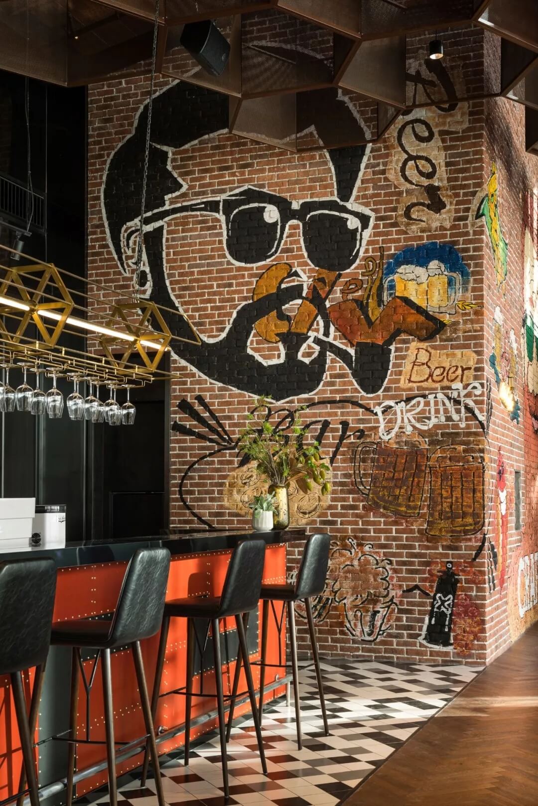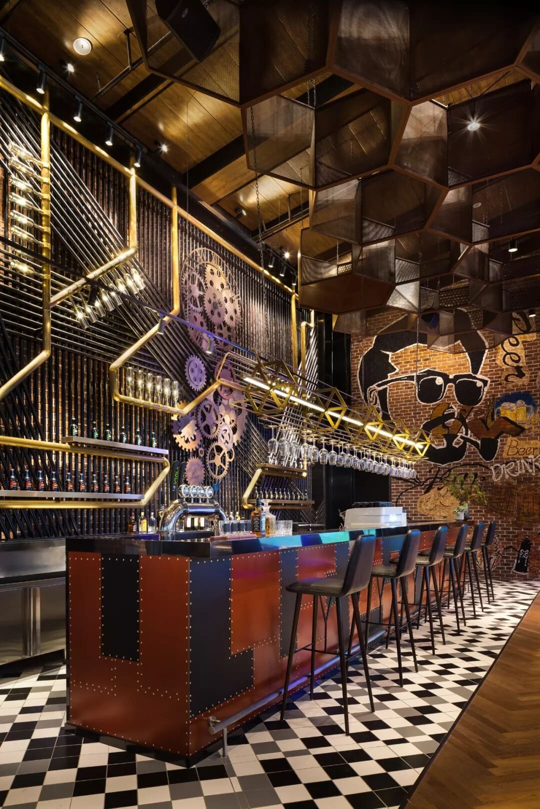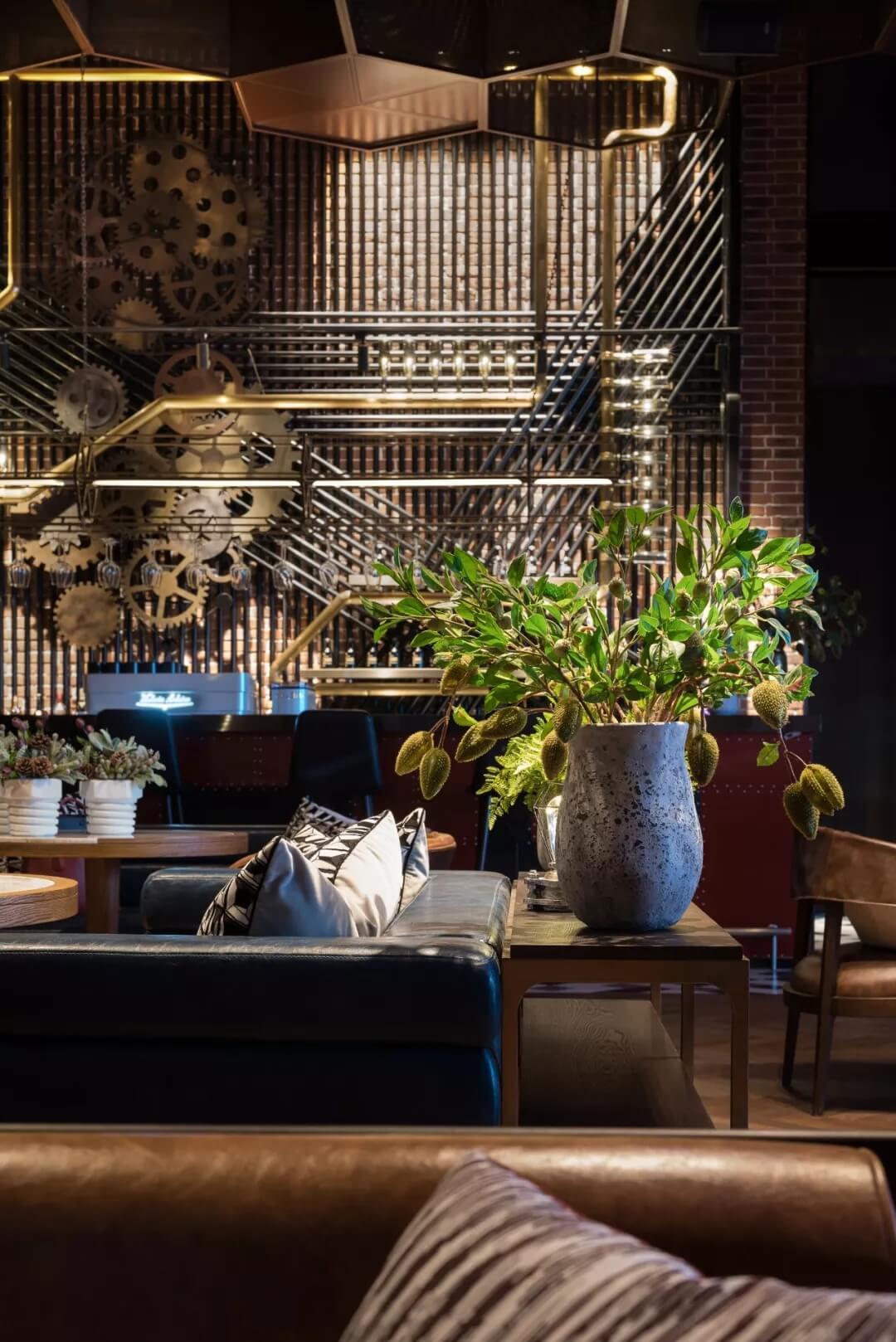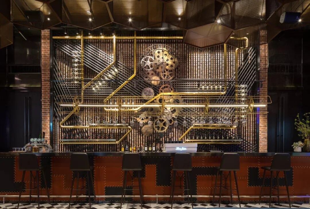 工業(yè)風(fēng)的精髓在于,在原空間樸拙素簡(jiǎn)的本真狀態(tài)下延展其自由隨性的氣質(zhì),在粗獷的空間架構(gòu)中消解拘束感,呈現(xiàn)出大氣又不失細(xì)膩的美感。粗礪的紅磚墻、朋克夸張的墻畫涂鴉、裸露的管道線路、復(fù)古做舊的齒輪掛件、紅黑交接的鉚釘吧臺(tái)......統(tǒng)攝進(jìn)工業(yè)風(fēng)的設(shè)計(jì)常規(guī)之中。