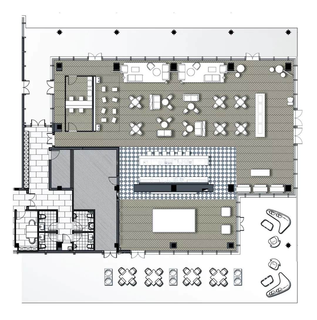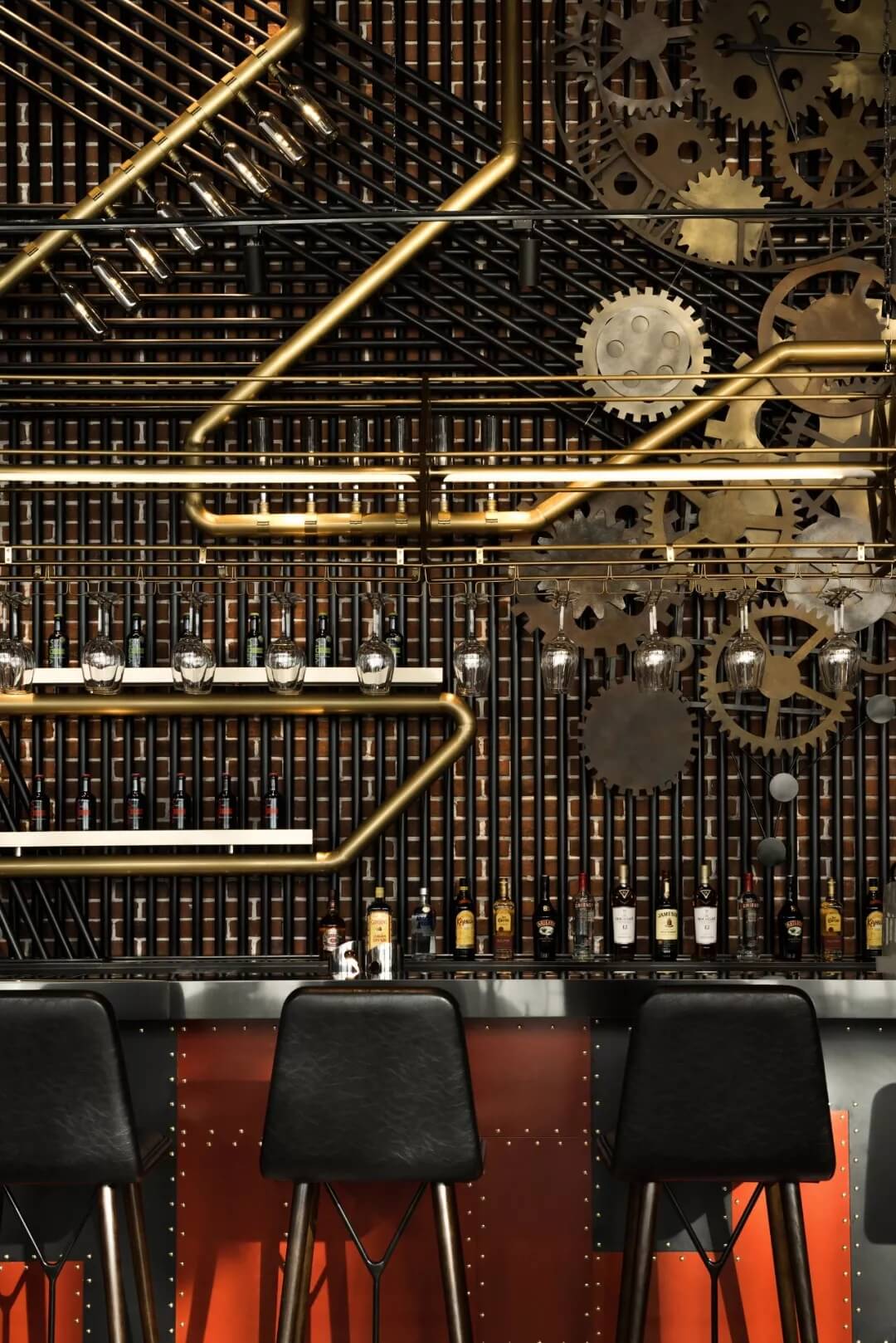 空間中所有符號(hào)語(yǔ)言均是設(shè)計(jì)的表象表達(dá),與其深邃豐富的內(nèi)在視像緊密相連。未經(jīng)修飾的混凝土、鋼材料與金屬組件透露出粗獷與質(zhì)樸的氣質(zhì),長(zhǎng)條燈飾融進(jìn)鐵藝管道的線條穿插中,以光影效果加強(qiáng)幾何美學(xué)里的明暗層次,在硬朗中體現(xiàn)熱情與溫暖,點(diǎn)染酒吧一隅的休閑氛圍。