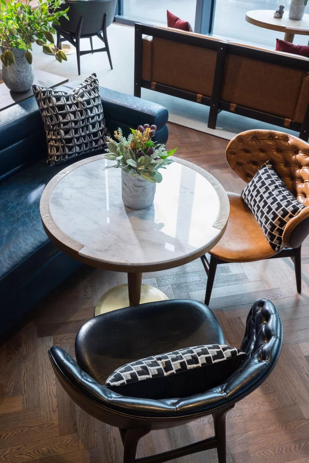 設(shè)計(jì)運(yùn)用極簡(jiǎn)的語(yǔ)言,打開空間與自然的悄聲對(duì)話,咖色的皮質(zhì)沙發(fā)、幾處花藝、數(shù)個(gè)土陶裝飾,充盈著活力與生氣,人們置身此處,身心分外舒愜。