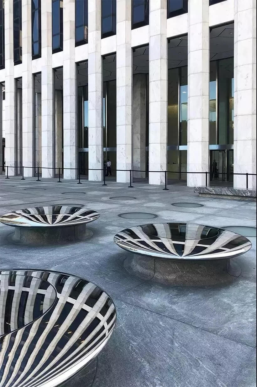 它們無(wú)縫的曲面造型讓人們既能坐在上面休息,又能在鏡中看到反射的城市建筑。