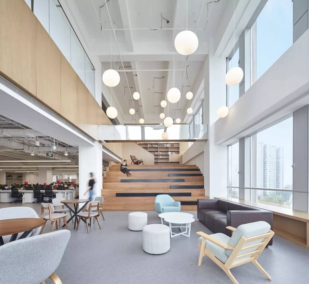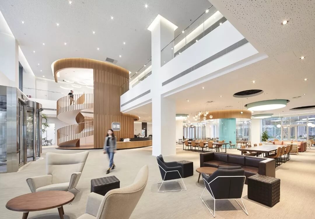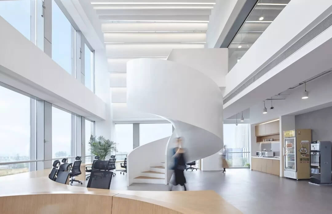 都市客廳島,選擇流暢線條的螺旋樓梯貫穿上下,運(yùn)用條形面板錯縫排列成弧形的照明方式,使整個空間照度均勻,且條形面板亦可作為裝飾展示面。家居軟裝選用極簡風(fēng)格,流線組擺方式,營造自由靈活的空間,促進(jìn)員工間的交流和溝通。