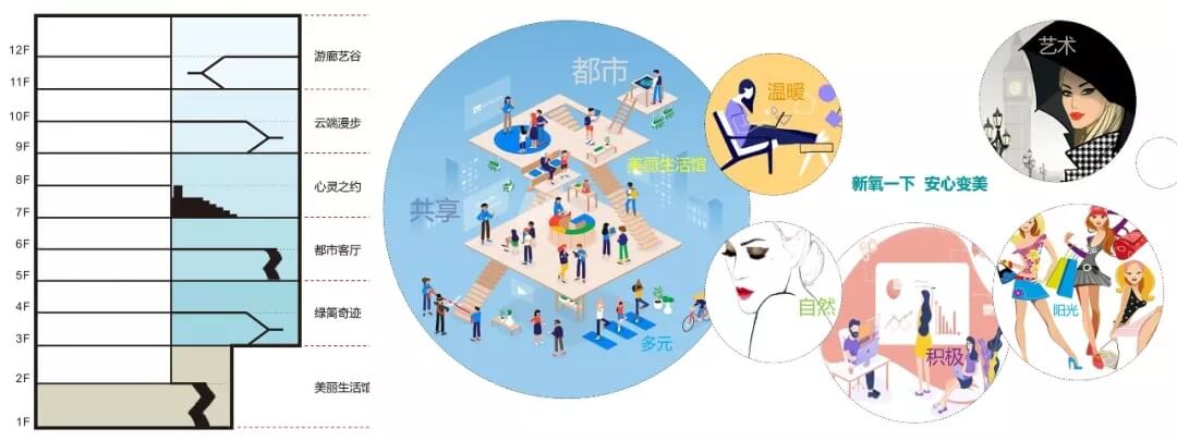 在此理念和品牌屬性的影響下,艾迪爾設(shè)計師布局辦公和診療空間,傳達(dá)出“舒適溫暖,積極自信,時尚藝術(shù),活力陽光”的氛圍。因此在大廳布局“美麗生活館”,建筑南側(cè)每兩層設(shè)計成不同主題的公共空間。