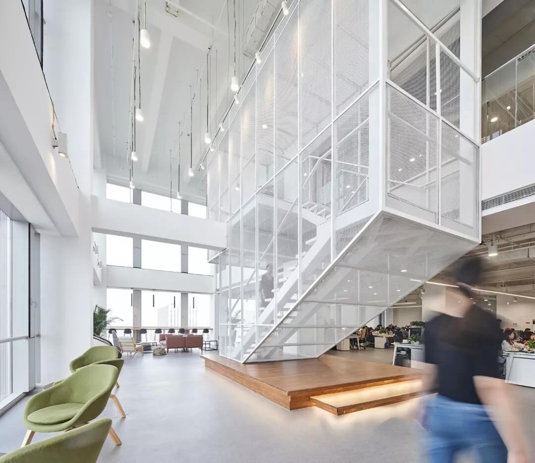 云端漫步主題島樓層公共空間設(shè)置了木質(zhì)的懸掛BOX,用白色的鋼網(wǎng)樓梯連接,樸素和輕盈通透形成鮮明的對比,如云端漫步,自然中蘊(yùn)含天馬行空,打開員工的創(chuàng)意想象。