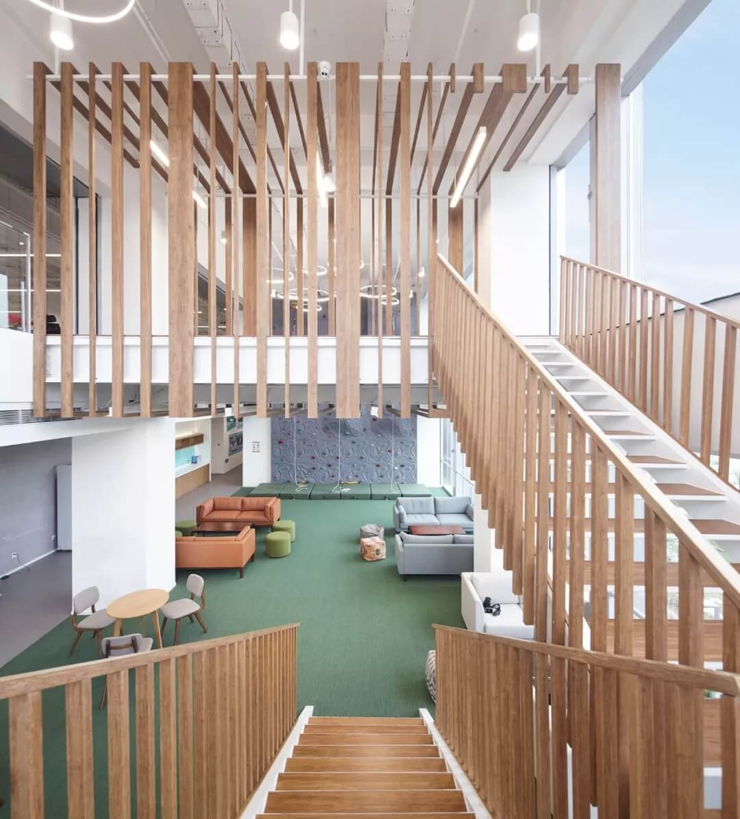 綠籬奇跡島,是自然,健康運(yùn)動,挑戰(zhàn)自我的主題公共空間。木質(zhì)格柵樓梯在二層延伸出一個通透的格柵BOX,形成豐富的空間層次和視覺高差。同時設(shè)置攀巖墻,瑜伽室和健身房,展現(xiàn)新氧人不懼挑戰(zhàn),運(yùn)動健康的生活方式。