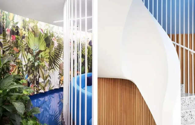 工作區(qū)采用中性色設(shè)計(jì),利于專注工作。淡粉色的走道是真正的情緒助推器,它喚起了員工之間的情感共鳴。精心布置的水源和雅致的燈光設(shè)計(jì)有助于帶來(lái)更愉悅的心情。熱帶壁紙與柔軟的沙發(fā)和小圓桌塑造了一個(gè)熱情洋溢的活力氛圍。