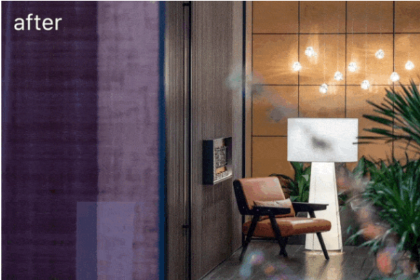 6.以木飾面格柵加玻璃的組合取代原始純玻璃墻面的布局,增加空間層次和細節(jié)。