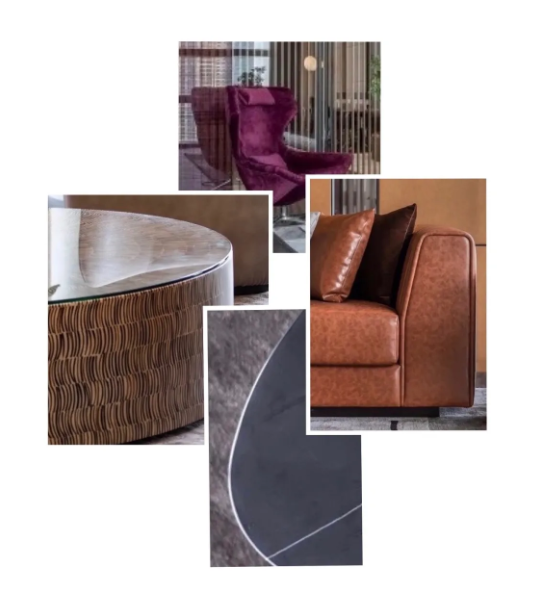 單椅大量使用皮革凸顯質(zhì)感,同時在家具上通過黑鋼、木及玻璃等打造硬朗穩(wěn)重的商務格調(diào)。