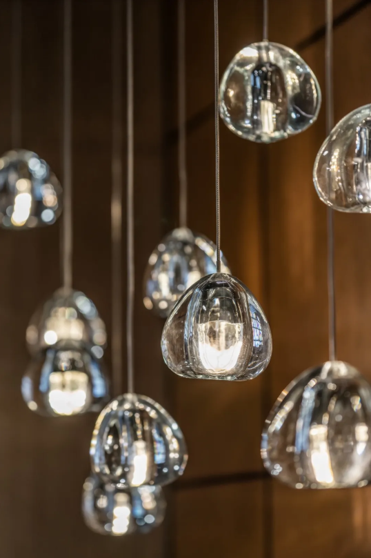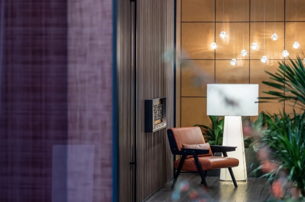 前廳一角,一把隨意的休閑椅構設出安靜而獨立的等候區(qū)。光是一味奇妙而誘惑的催化劑,見證格柵的參差錯落,旖旎于水滴狀通透吊燈,如同午夜巴黎那一杯令人情迷的威士忌,透過光影的變幻,實現(xiàn)精尚定調(diào)。