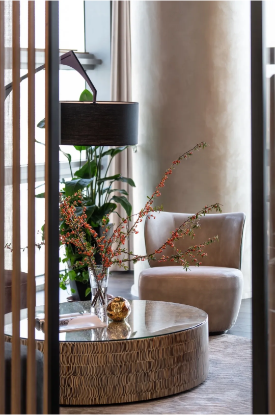 接待區(qū)以弧形沙發(fā)圍合成互動性強的洽談狀態(tài),金屬紋理圓幾在光的參與下呈現(xiàn)精致的一面,格柵半掩,意式沙色時尚簡約家具,凸顯了實用與美學的無聲契合。