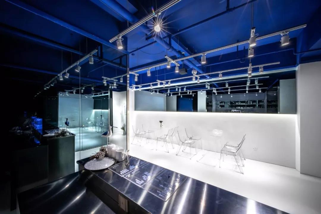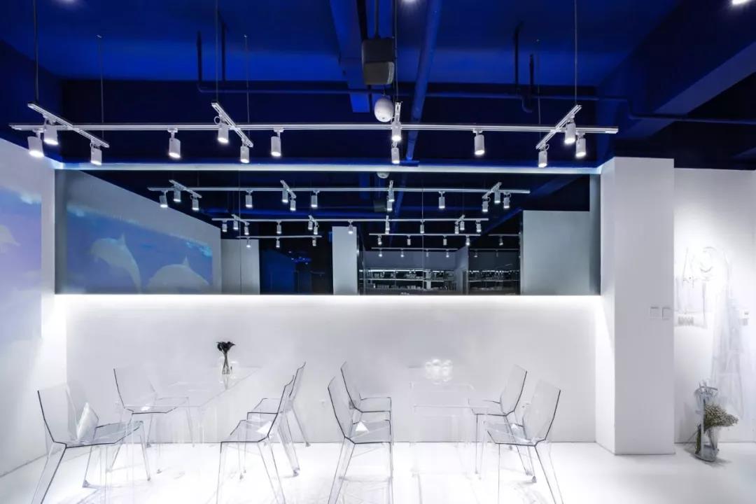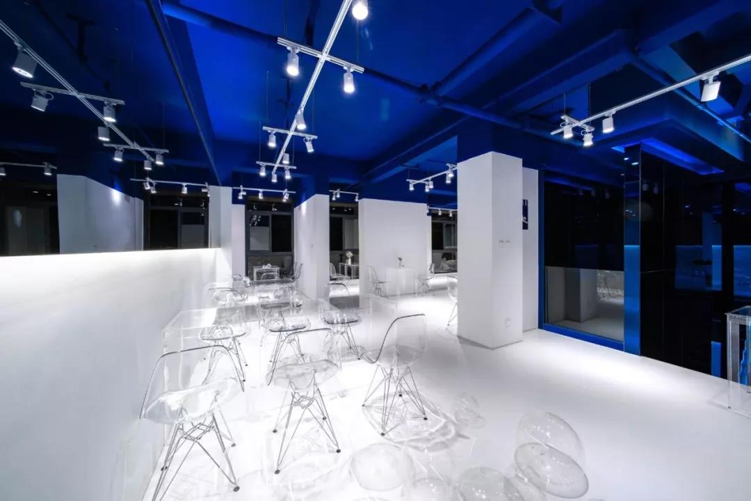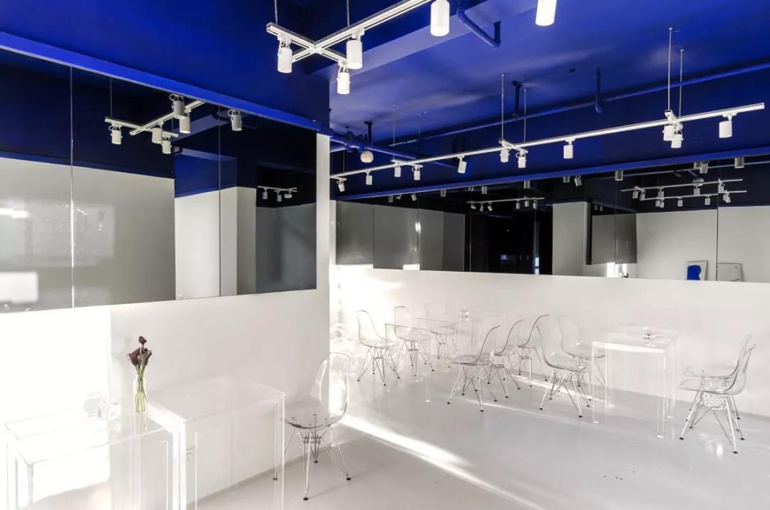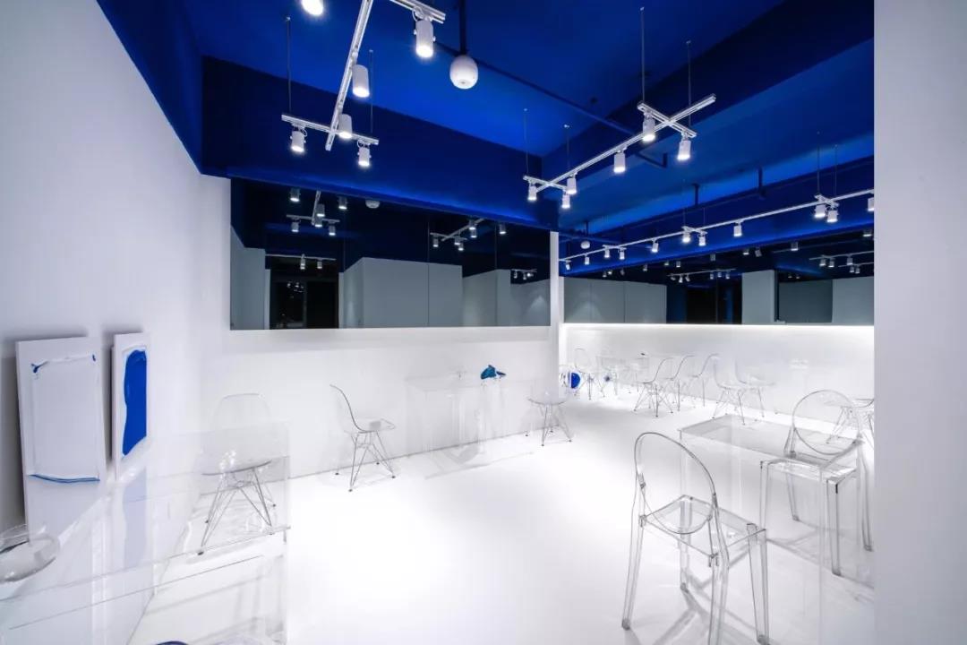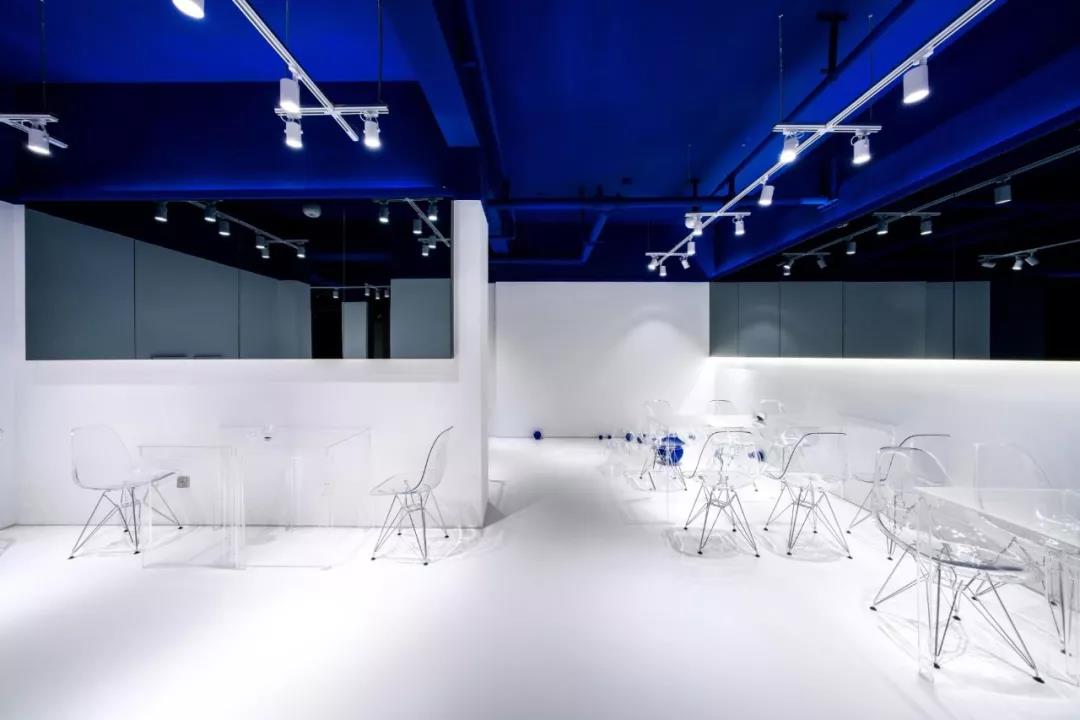 帶著這樣的邏輯,整個(gè)空間的設(shè)計(jì)就很明確了,拆除原有的吊頂,用涂料做成藍(lán)色的“天空”;下面的空間則使用帶有反射性/透明性的材料——鏡面、金屬、亞克力、塑料等,通過這種曖昧的委婉的,而非簡(jiǎn)單粗暴的方式,讓深海的藍(lán)色充滿整個(gè)空間。