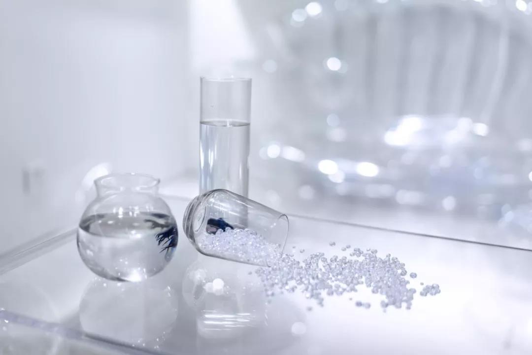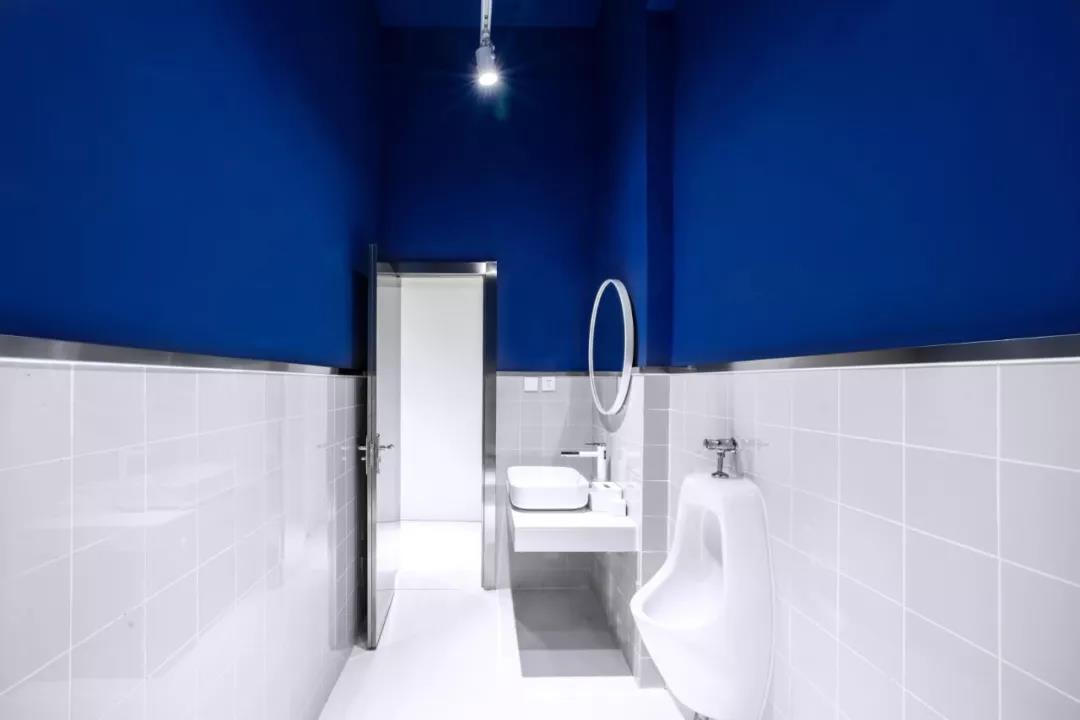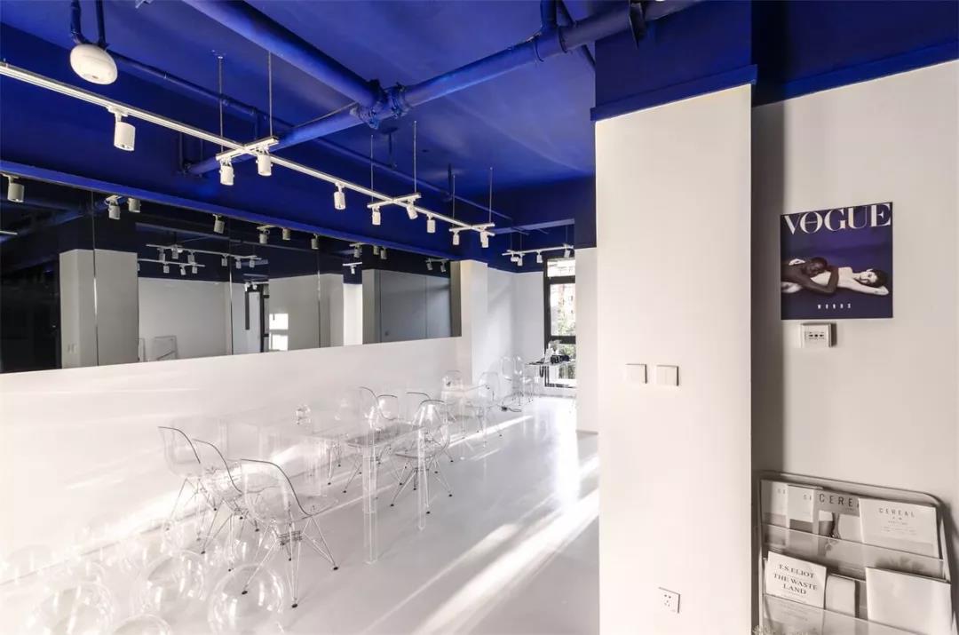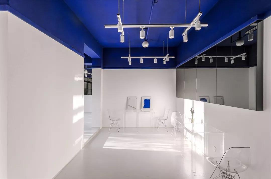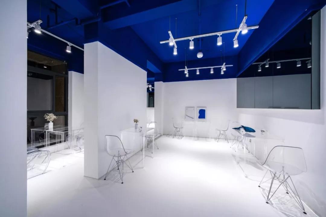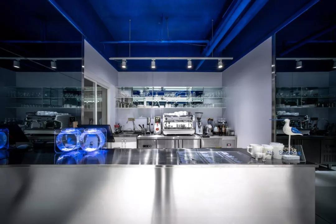 帶著這樣的邏輯,整個(gè)空間的設(shè)計(jì)就很明確了,拆除原有的吊頂,用涂料做成藍(lán)色的“天空”;下面的空間則使用帶有反射性/透明性的材料——鏡面、金屬、亞克力、塑料等,通過這種曖昧的委婉的,而非簡(jiǎn)單粗暴的方式,讓深海的藍(lán)色充滿整個(gè)空間。