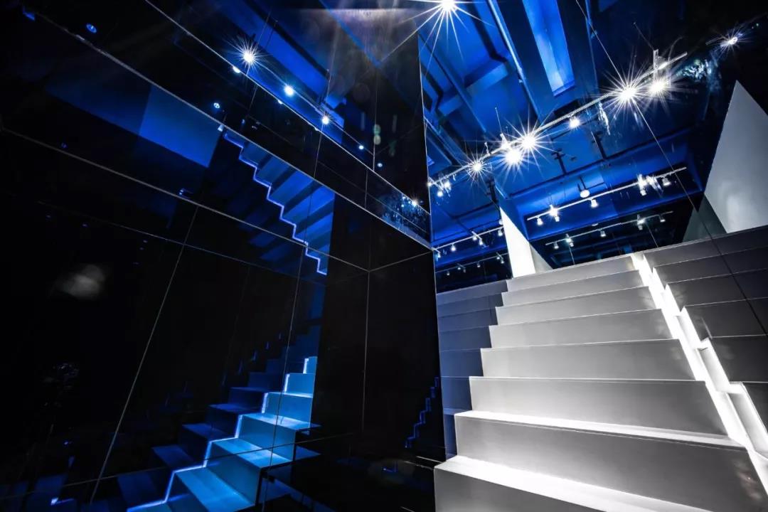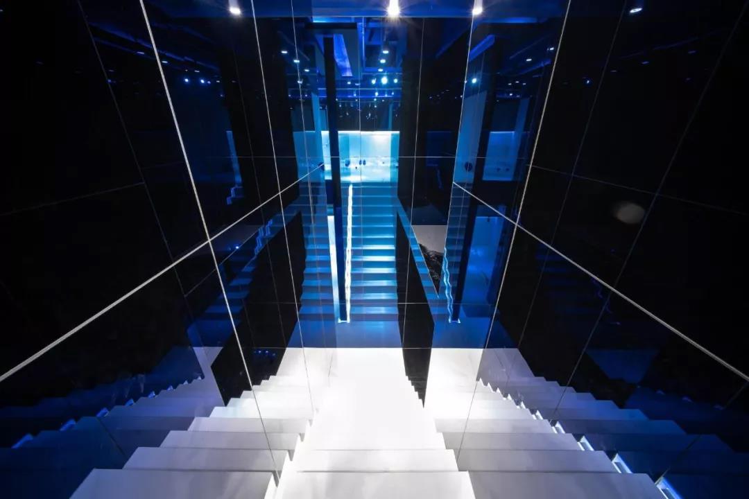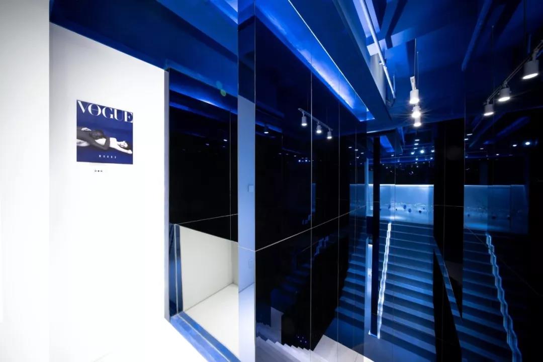 鏡面材質(zhì)方面,大面積使用的玻璃鏡面增加了空間的延伸感和開闊性,而鏡面的安裝則在通過多層板固定在墻面,并且鏡面外邊框則通過多層板開暗槽暗藏了LED燈帶創(chuàng)造出鏡面懸浮在空中的效果。設(shè)計(jì)中出現(xiàn)了普通的灰鏡以及在樓梯空間部分為了強(qiáng)調(diào)反射效果而采用的藍(lán)鏡,樓梯空間的大面積鏡面配合不同地方的光源、以及藍(lán)色頂面不同層次的漫反射創(chuàng)造出一種夢(mèng)幻的效果。