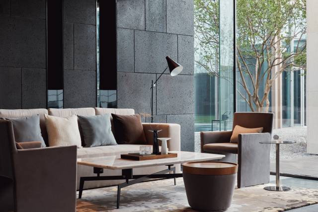 以不同材質(zhì)的搭配、巧妙的材料收口手法突出空間的精致,同時在空間中注重光影效果的表達(dá),利用外圍玻璃幕墻通透的特點將自然光引入室內(nèi),基于建筑內(nèi)部不同的空間特點予以藝術(shù)光源作點綴。空間氛圍積極且又彰顯出人文內(nèi)涵,身臨其境可實現(xiàn)人、自然、光三重情感的呼應(yīng)。