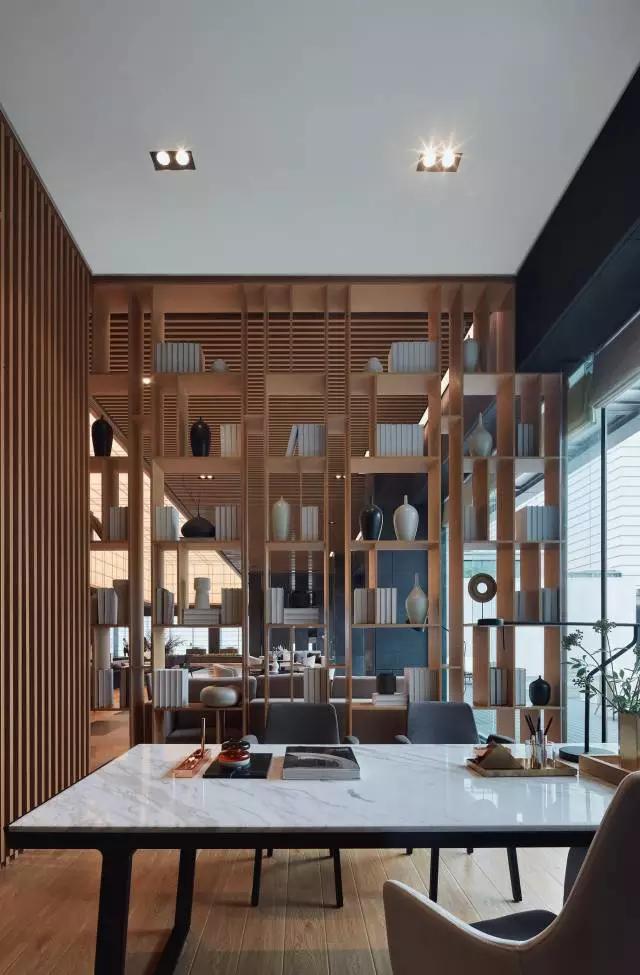 VIP區(qū)域原木色書架、豎向的木百葉有效阻隔區(qū)分空間,與周圍關(guān)系相互連接又互不打擾,形成半開放式的私密空間,整體保證了空間的互動性與獨(dú)立性。在這個“書卷留白筆墨濃”的區(qū)域,營造出靜心一隅,構(gòu)筑具有人文氣息和品質(zhì)感的氛圍。