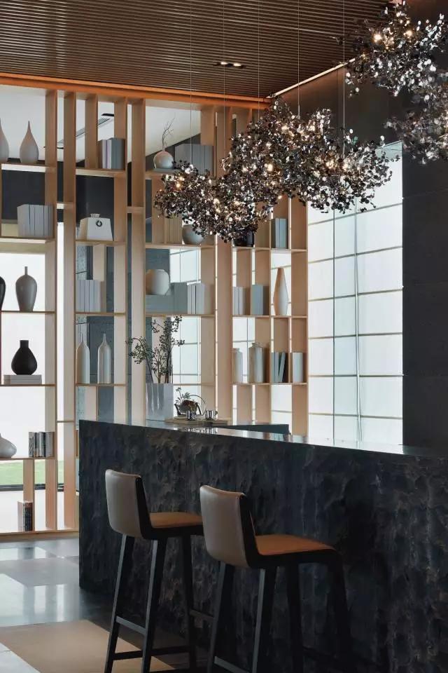 水吧臺以毛鑿面的形式呈現(xiàn),質(zhì)樸卻別具一格。而光線透射在吧臺頂面,又與書架、吊燈以及頂部的木百葉形成互動,勾勒出繽紛的空間輪廓。粗獷肌理感的石材,又與花瓣式的吊燈形成材質(zhì)上的鮮明對比,晶瑩璀璨。