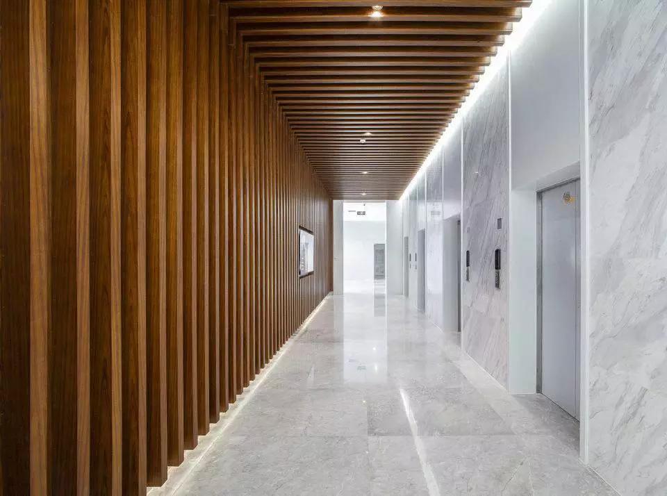 不同的空間內(nèi)容對(duì)應(yīng)不同的材質(zhì)氛圍,從色彩到質(zhì)感,再到意象化的裝飾,我們依據(jù)大堂、會(huì)議、休息室、中庭等不同空間尺度與空間內(nèi)容營(yíng)造新穎豐富、恰如其分的空間氛圍。溫暖的木色、混凝土板、白色大理石和白色乳膠漆為主要材料,其中報(bào)告廳大異其趣,優(yōu)雅高貴的深灰色布藝軟包與報(bào)告廳的相對(duì)集中和封閉性相得益彰。我們依托原有建筑空間序列,如大堂-電梯廳-等候區(qū)-多功能廳-VIP室-展廳,調(diào)整改變室內(nèi)設(shè)計(jì)的溫度與濃度,為原本純功能理性化的空間組織蒙上一層魅力面紗,讓功能化的“經(jīng)過(guò)”變?yōu)橐淮尾簧岬鸟v留與感受。