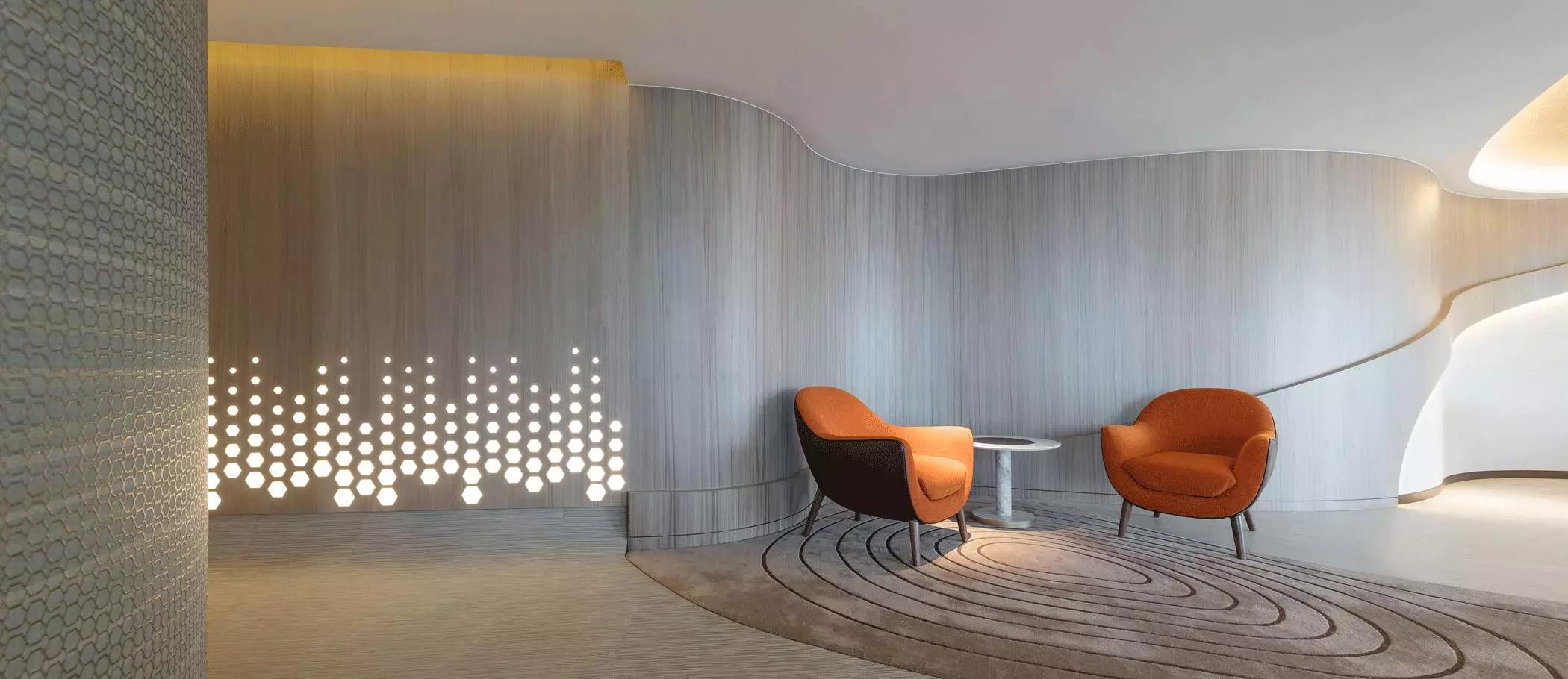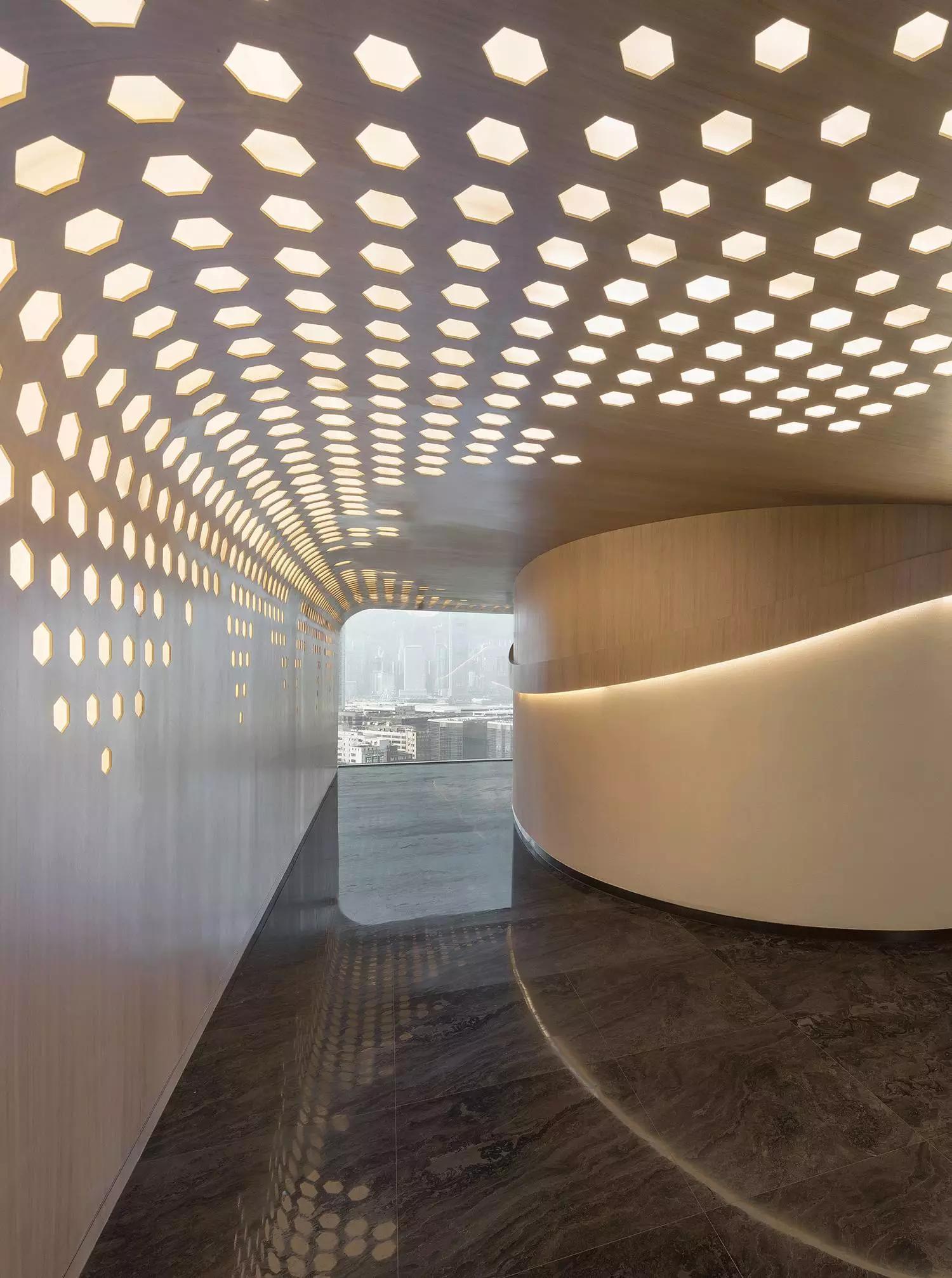 蜂窩形狀滲進(jìn)天花至墻身的燈箱以及屏風(fēng),體現(xiàn)出大自然的親和力讓人心沈靜,宛若森林小徑,葉縫間穿過(guò)而灑落的陽(yáng)光,體現(xiàn)日本韻文中的「Komorebi」靜謐而悠閑涵蘊(yùn)希望。