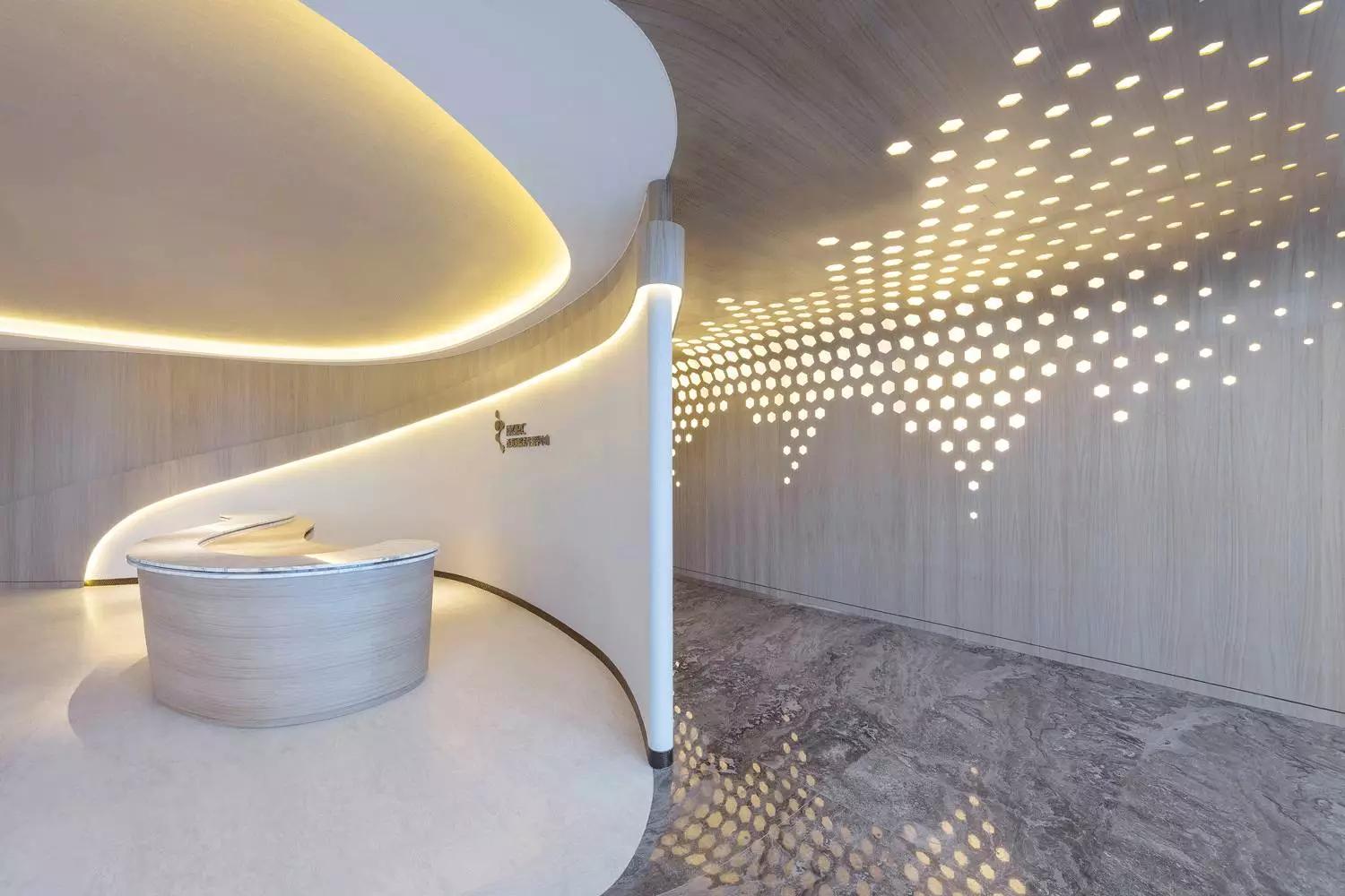 這一切該歸功于大自然的靈感,醫(yī)療中心的正門(mén)萃取最純?nèi)坏哪静?,配合溫暖的燈光分布,隨著流線(xiàn)形的空間引導(dǎo)訪(fǎng)客步進(jìn)全開(kāi)放的接待處。