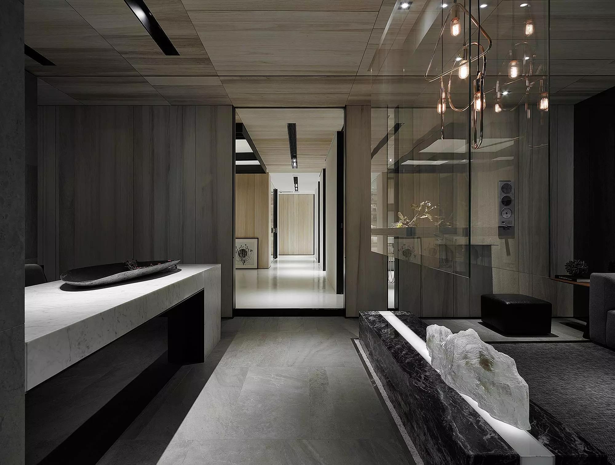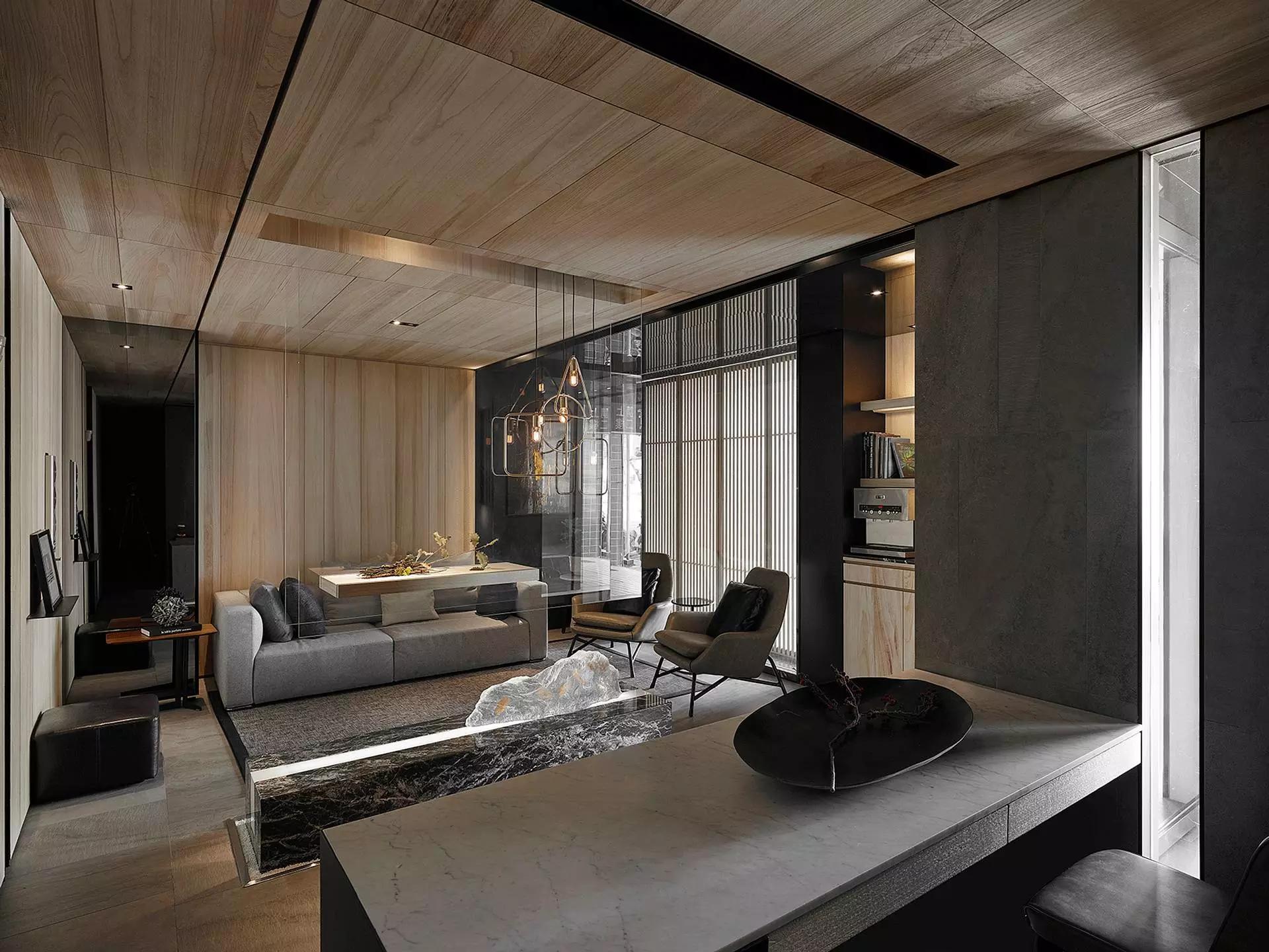 將玄關(guān)刻意退縮于室內(nèi)、入口大門轉(zhuǎn)向,而產(chǎn)生一進一景之空間體驗層次,寬闊的騎樓面積與門口的虛空間,未踏入空間卻已感受沈穩(wěn)安定。